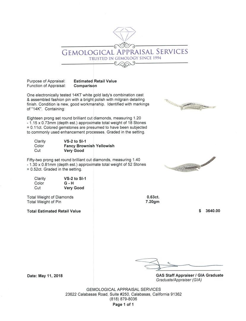 One electronically tested 14KT white gold lady's combination cast & assembled fashion pin with a bright polish with milgrain detailing finish. Identified with markings of '14K'. Condition is new, good workmanship. Containing: Eighteen prong set round brilliant cut diamonds, measuring 1.20 - 1.15 x 0.73mm (depth est.) approximate total weight of 18 Stones = 0.11ct. Colored gemstones are presumed to have been subjected to commonly used enhancement processes. Graded in the setting. Color Fancy Brownish Yellowish Clarity VS-2 to SI-1 Cut Very Good Fifty-Two prong set round brilliant cut diamonds, measuring 1.40 - 1.30 x 0.81mm (depth est.) approximate total weight of 52 Stones = 0.52ct. Graded in the setting. Color G - H Clarity VS-2 to SI-1 Cut Very Good. Total Weight of Diamonds 0.63ct.. Total Weight of Pin 7.20gm GAS Appraised at $3640.00. GAS Appraised at $3,640.00.