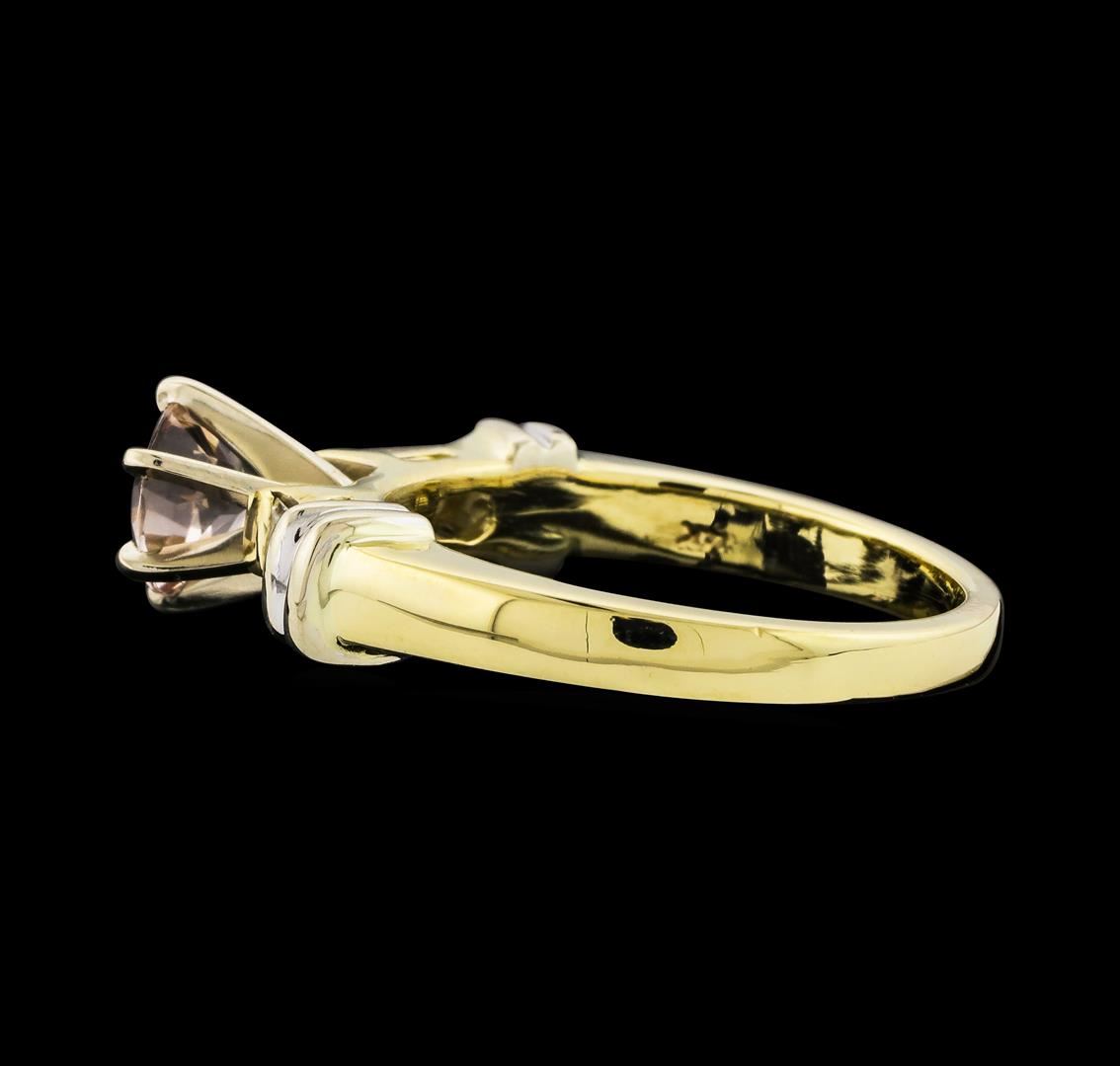 One Morganite and Diamond Ring featuring: 14KT Yellow Gold with a total weight of 5.15 grams, Morganite with a total weight of 0.63ct, and side diamonds with a total weight of 0.20ctw.