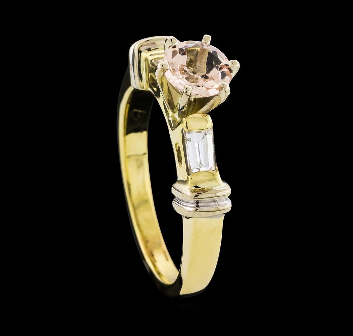 One Morganite and Diamond Ring featuring: 14KT Yellow Gold with a total weight of 5.15 grams, Morganite with a total weight of 0.63ct, and side diamonds with a total weight of 0.20ctw.