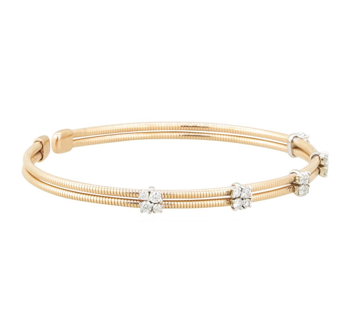 One electronically tested 14KT rose gold ladies cast & assembled diamond cuff bracelet. The flexible cuff style bracelet features a series of five diamond cluster stations. Measures six and one half inches wearable length. Bright polish finish with white gold accents. Identified with markings of "14K". Condition is new, good workmanship. Containing: Twenty prong set round brilliant cut diamonds approximate total weight of 20 Stones = 0.64ct. The clarity & color grade reflect the overall average for the group. Graded in the setting. Clarity SI-2 to I-2 Color F - H Total Weight of Diamonds 0.64 ct. Total Weight of Cuff Bracelet 7.50 gm Estimated Retail Value $ 3,125.00 US