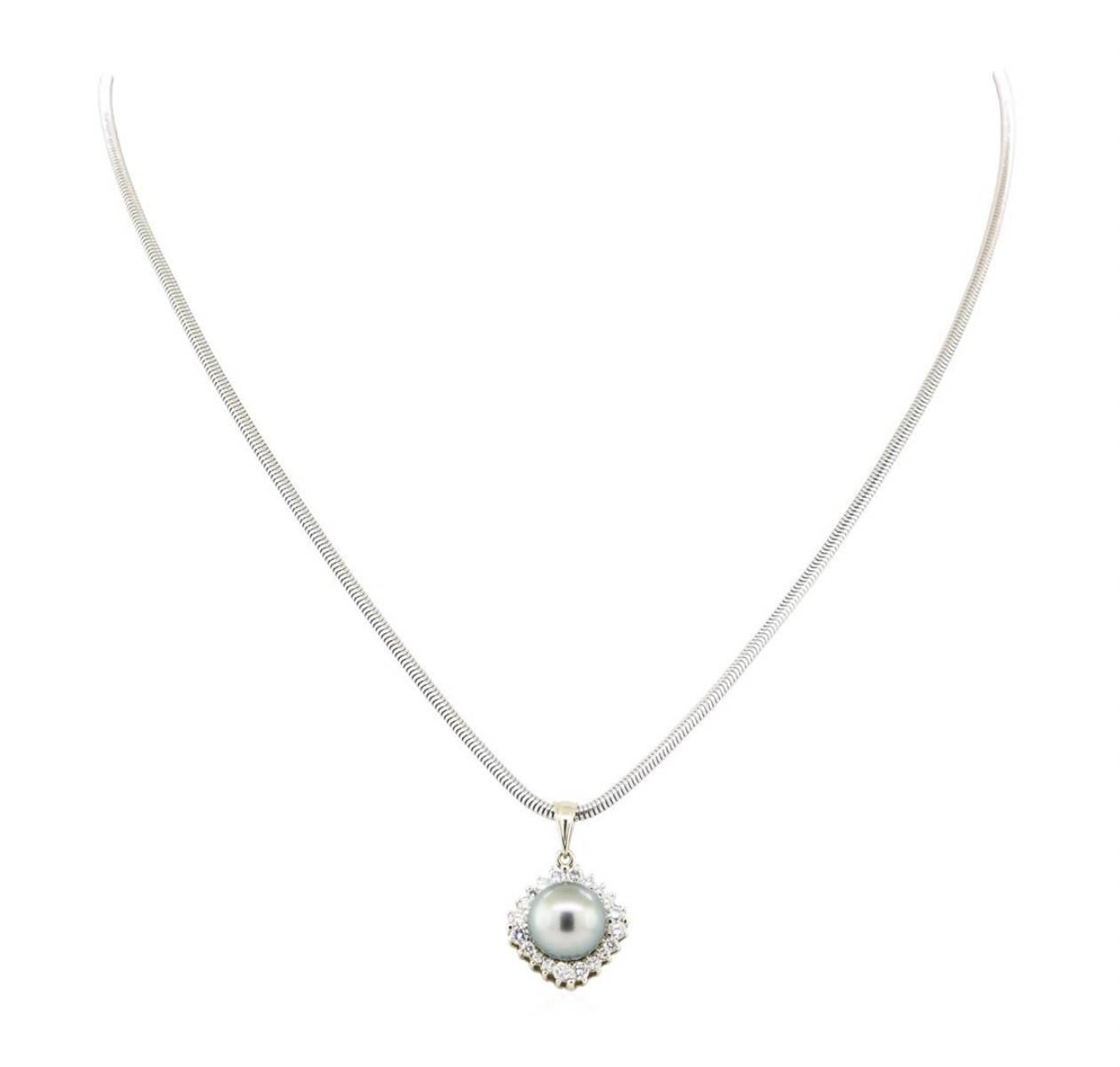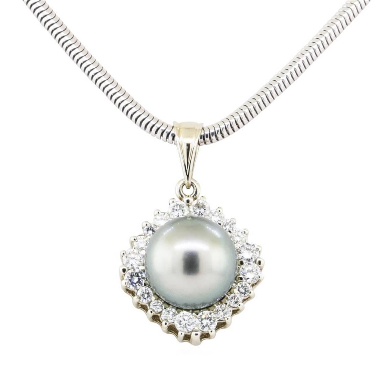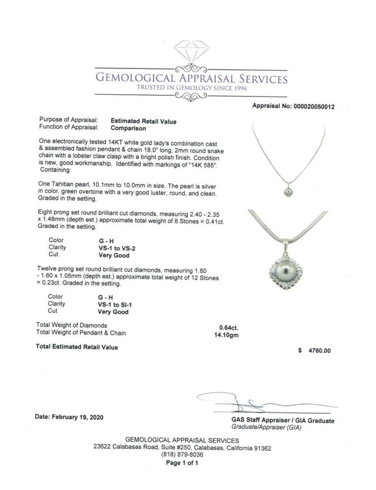 One electronically tested 14KT white gold lady's combination cast & assembled fashion pendant & chain 18.0' long, 2mm round snake chain with a lobster claw clasp with a bright polish finish. Identified with markings of '14K 585'. Condition is new, good workmanship. Containing: One Tahitian pearl, 10.1mm to 10.0mm in size. The pearl is silver in color, green overtone with a very good luster, round, and clean. Graded in the setting. Eight prong set round brilliant cut diamonds, measuring 2.40 - 2.35 x 1.48mm (depth est.) approximate total weight of 8 Stones = 0.41ct. Graded in the setting. Color G - H Clarity VS-1 to VS-2 Cut Very Good Twelve prong set round brilliant cut diamonds, measuring 1.80 - 1.60 x 1.05mm (depth est.) approximate total weight of 12 Stones = 0.23ct. Graded in the setting. Color G - H Clarity VS-1 to SI-1 Cut Very Good. Total Weight of Diamonds 0.64ct.. Total Weight of Pendant & Chain 14.10gm GAS Appraised at $4760.00. GAS Appraised.