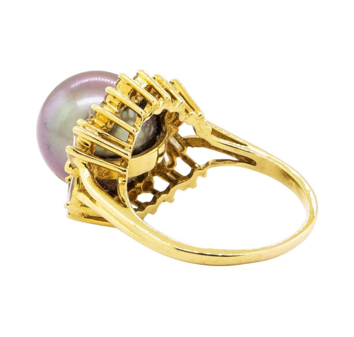 One electronically tested 18KT yellow gold lady's combination cast & assembled fashion ballerina ring with a handmade wire basket with a bright polish finish. The featured lady's ring has a shank measuring 1.50 millimeters wide. Identified with markings of '18K'. Condition is like new, good workmanship. Containing: One Tahitian pearl, 12.9mm to 12.9mm in size. The pearl is black in color, green overtone with a very good luster, round, and clean. Graded in the setting. Eight prong set baguette cut diamonds, measuring from 3.20 x 1.20 x 1.02mm (depth est.) to 3.30 x 1.30 x 1.11mm (depth est.) approximate total weight of 8 Stones = 0.32ct. Graded in the setting. Color F - G Clarity VS-1 to VS-2 Cut Very Good Fourteen prong set round brilliant cut diamonds, measuring 1.85 - 1.80 x 1.13mm (depth est.) approximate total weight of 14 Stones = 0.32ct. Graded in the setting. Color F - G Clarity VS-1 to VS-2 Cut Very Good. Total Weight of Diamonds 0.64ct.. Total Weight of Ring 9.20gm GAS Appraised at $6710.00. GAS Appraised.