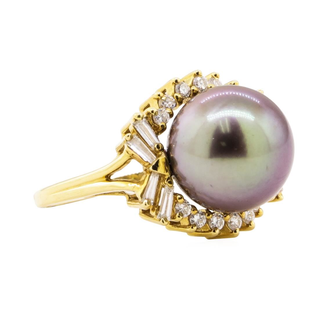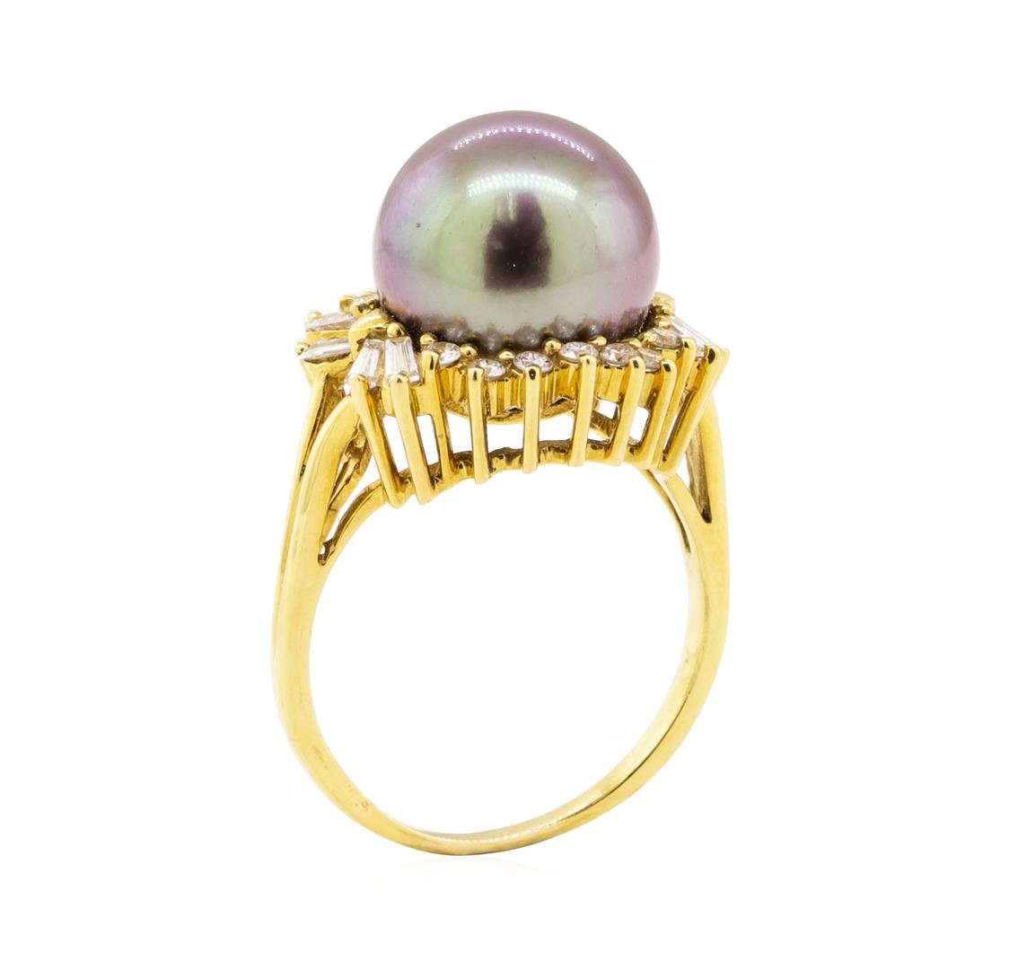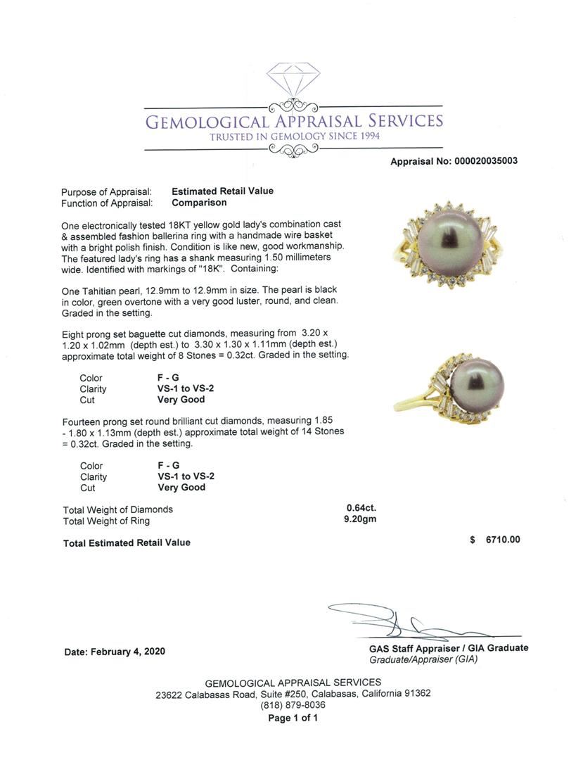 One electronically tested 18KT yellow gold lady's combination cast & assembled fashion ballerina ring with a handmade wire basket with a bright polish finish. The featured lady's ring has a shank measuring 1.50 millimeters wide. Identified with markings of '18K'. Condition is like new, good workmanship. Containing: One Tahitian pearl, 12.9mm to 12.9mm in size. The pearl is black in color, green overtone with a very good luster, round, and clean. Graded in the setting. Eight prong set baguette cut diamonds, measuring from 3.20 x 1.20 x 1.02mm (depth est.) to 3.30 x 1.30 x 1.11mm (depth est.) approximate total weight of 8 Stones = 0.32ct. Graded in the setting. Color F - G Clarity VS-1 to VS-2 Cut Very Good Fourteen prong set round brilliant cut diamonds, measuring 1.85 - 1.80 x 1.13mm (depth est.) approximate total weight of 14 Stones = 0.32ct. Graded in the setting. Color F - G Clarity VS-1 to VS-2 Cut Very Good. Total Weight of Diamonds 0.64ct.. Total Weight of Ring 9.20gm GAS Appraised at $6710.00. GAS Appraised.