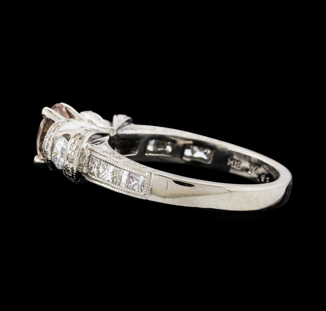 One Morganite and Diamond Ring featuring: 18KT White Gold with a total weight of 5.00 grams, Morganite with a total weight of 0.64ct, and side diamonds with a total weight of 0.63ctw.