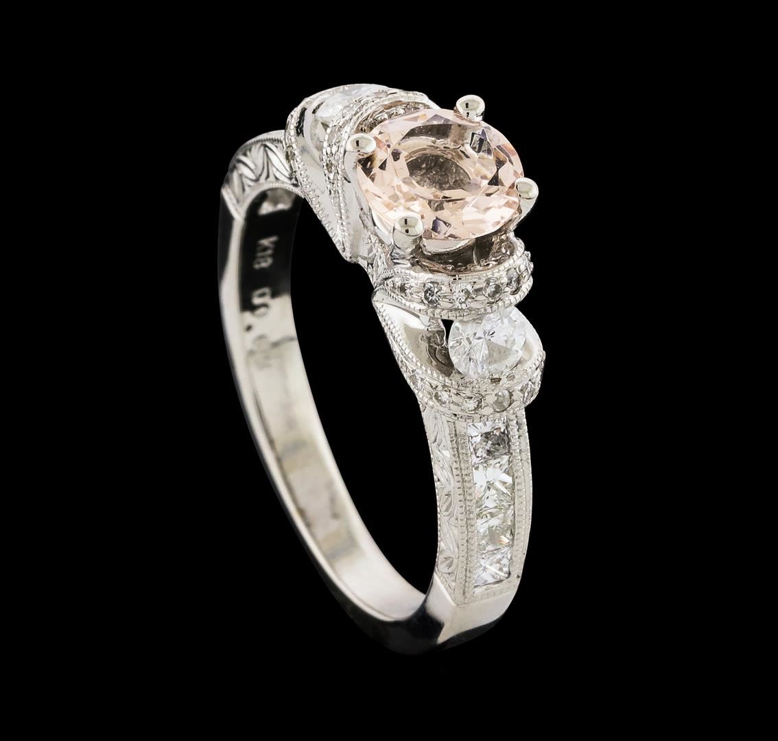 One Morganite and Diamond Ring featuring: 18KT White Gold with a total weight of 5.00 grams, Morganite with a total weight of 0.64ct, and side diamonds with a total weight of 0.63ctw.