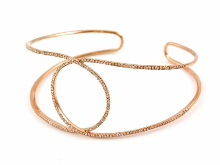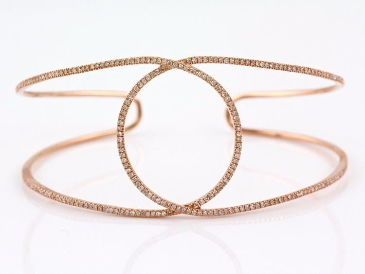|**Total Carat Weight:0.64|**Clarity:Si2-Si3|**Cut:Verry Good|**Setting:Micro Pave Set|**Main Stone:|**MAIN Stone Treatment:Not Enhanced|**Main Stone Color:|**Main Stone Color:Round|**Theme:|**Length Inches:|**Ring Size:6.5|**Style:Cuff|**Metal Purity:14k|**Metal:Rose Gold|**Gold Weight:7.77g|**Dimension:|**Diamond Color:G-H|**Sizable:Yes|**Condition A brand-new, unused, and unworn item (including handmade items) in the original packaging (such as the original box or bag) and/or with the original tags attached|**Remarks: Colorless Diamonds, With no visible inclusions to the unaided eye. 0.64ct - 232pcs. - 0.7mm - Round Diamonds (Not Enhanced) SETTING: Micro Pave Set. CUFF HEIGHT: 25mm Approx. DESIGN: Overlap Cuff Motif Cuff, WEIGHT OF GOLD: 7.77g - 14K Solid Rose Gold - ("14K" Metal Stamp) Bracelet Size: 6.5" Adjustable