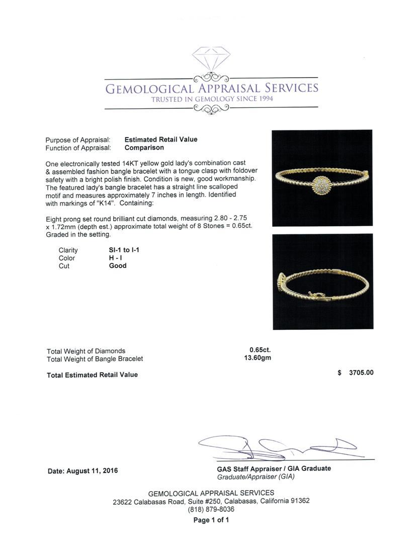 One electronically tested 14KT yellow gold lady's combination cast & assembled fashion bangle bracelet with a tongue clasp with foldover safety with a bright polish finish. The featured lady's bangle bracelet has a straight line scalloped motif and measures approximately 7 inches in length. Identified with markings of 'K14'. Condition is new, good workmanship. Containing: Eight prong set round brilliant cut diamonds, measuring 2.80 - 2.75 x 1.72mm (depth est.) approximate total weight of 8 Stones = 0.65ct. Graded in the setting. Clarity SI-1 to I-1. Color: H - I Cut Good. Total Weight of Diamonds 0.65ct.. Total Weight of Bangle Bracelet 13.60gm. GAS Appraised at $3,705.00.