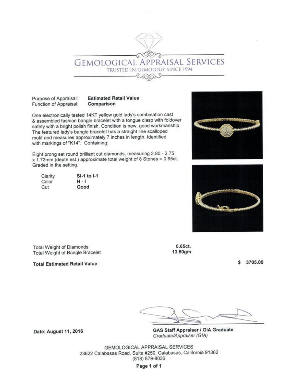 One electronically tested 14KT yellow gold lady's combination cast & assembled fashion bangle bracelet with a tongue clasp with foldover safety with a bright polish finish. The featured lady's bangle bracelet has a straight line scalloped motif and measures approximately 7 inches in length. Identified with markings of 'K14'. Condition is new, good workmanship. Containing: Eight prong set round brilliant cut diamonds, measuring 2.80 - 2.75 x 1.72mm (depth est.) approximate total weight of 8 Stones = 0.65ct. Graded in the setting. Clarity SI-1 to I-1. Color: H - I Cut Good. Total Weight of Diamonds 0.65ct.. Total Weight of Bangle Bracelet 13.60gm. GAS Appraised.