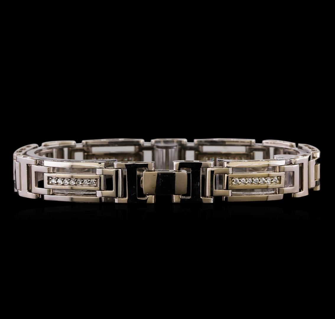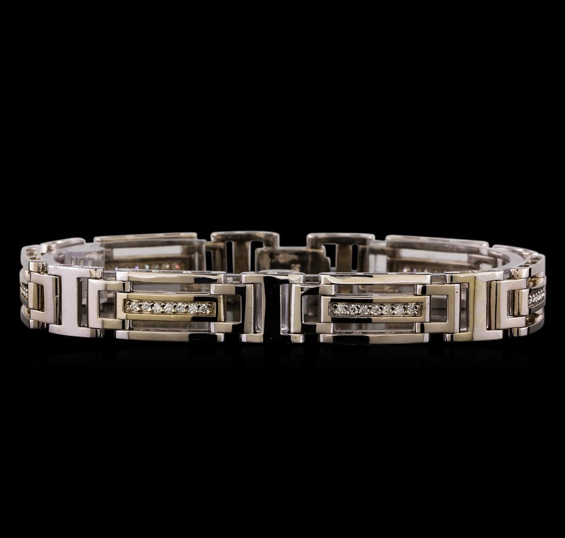 One electronically tested 14KT white gold man's combination cast & assembled fashion bracelet with a foldover clasp with a bright polish finish. The featured man's bracelet measures approximately 8 inches in length. Identified with markings of '14K'. Condition is new, good workmanship. Containing: Forty-Two prong set round brilliant cut diamonds, measuring 1.60 - 1.55 x 0.98mm (depth est.) approximate total weight of 42 Stones = 0.65ct. Graded in the setting. Clarity SI-1 to SI-2. Color: H - I Cut Good. Total Weight of Diamonds 0.65ct.. Total Weight of Bracelet 37.20gm. GAS Appraised at $8,380.00.