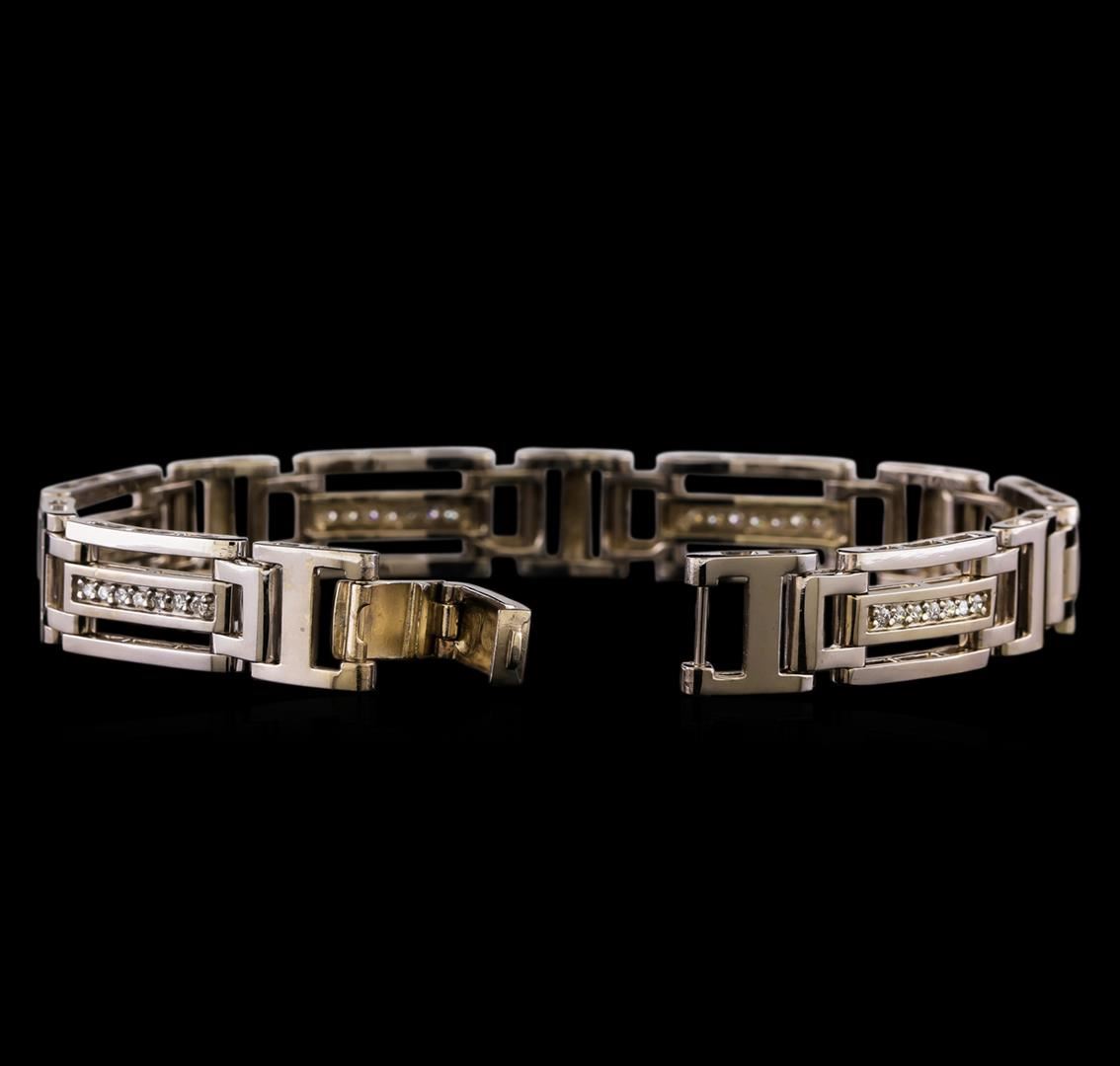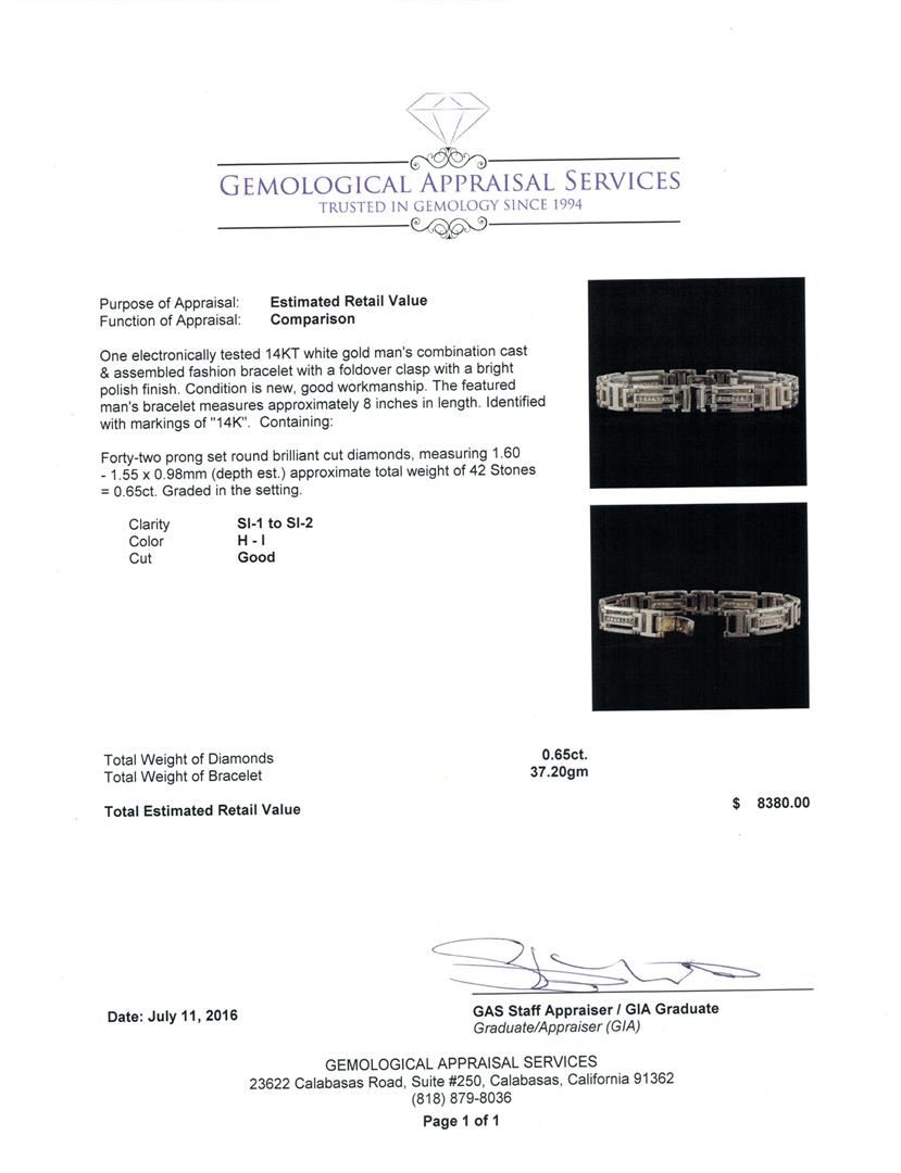 One electronically tested 14KT white gold man's combination cast & assembled fashion bracelet with a foldover clasp with a bright polish finish. The featured man's bracelet measures approximately 8 inches in length. Identified with markings of '14K'. Condition is new, good workmanship. Containing: Forty-Two prong set round brilliant cut diamonds, measuring 1.60 - 1.55 x 0.98mm (depth est.) approximate total weight of 42 Stones = 0.65ct. Graded in the setting. Clarity SI-1 to SI-2. Color: H - I Cut Good. Total Weight of Diamonds 0.65ct.. Total Weight of Bracelet 37.20gm. GAS Appraised at $8,380.00.