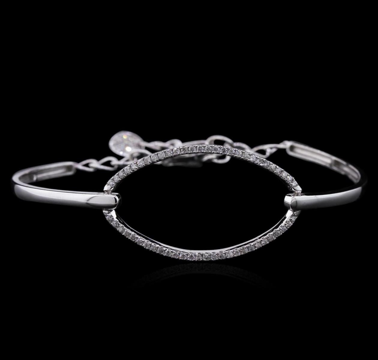 One electronically tested 14KT white gold lady's combination cast & assembled fashion bracelet with a lobster claw clasp with a bright polish finish. The featured lady's bracelet measures approximately 8 inches in length and contains a diamond set circle motif attached to the chain. Identified with markings of "K14". Condition is new, good workmanship. Containing: Fifty-Six prong set round brilliant cut diamonds, measuring 1.40 - 1.30 x 0.88mm (depth est.) approximate total weight of 56 Stones = 0.54ct. Graded in the setting. Clarity: SI-1 to SI-2 . Color: G - I. Cut Good Eighteen prong set round brilliant cut diamonds, measuring 1.20 - 1.10 x 0.75mm (depth est.) approximate total weight of 18 Stones = 0.11ct. Graded in the setting. Clarity: SI-1 to SI-2 . Color: G - I. Cut Good. Total Weight of Diamonds 0.65ct.. Total Weight of Bracelet 10.10gm at $ 3425.00 GAS Appraised.