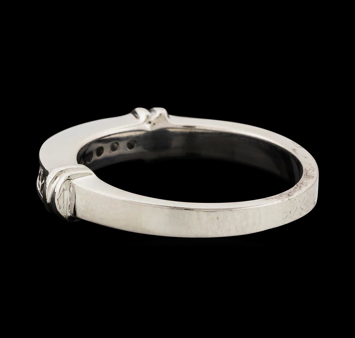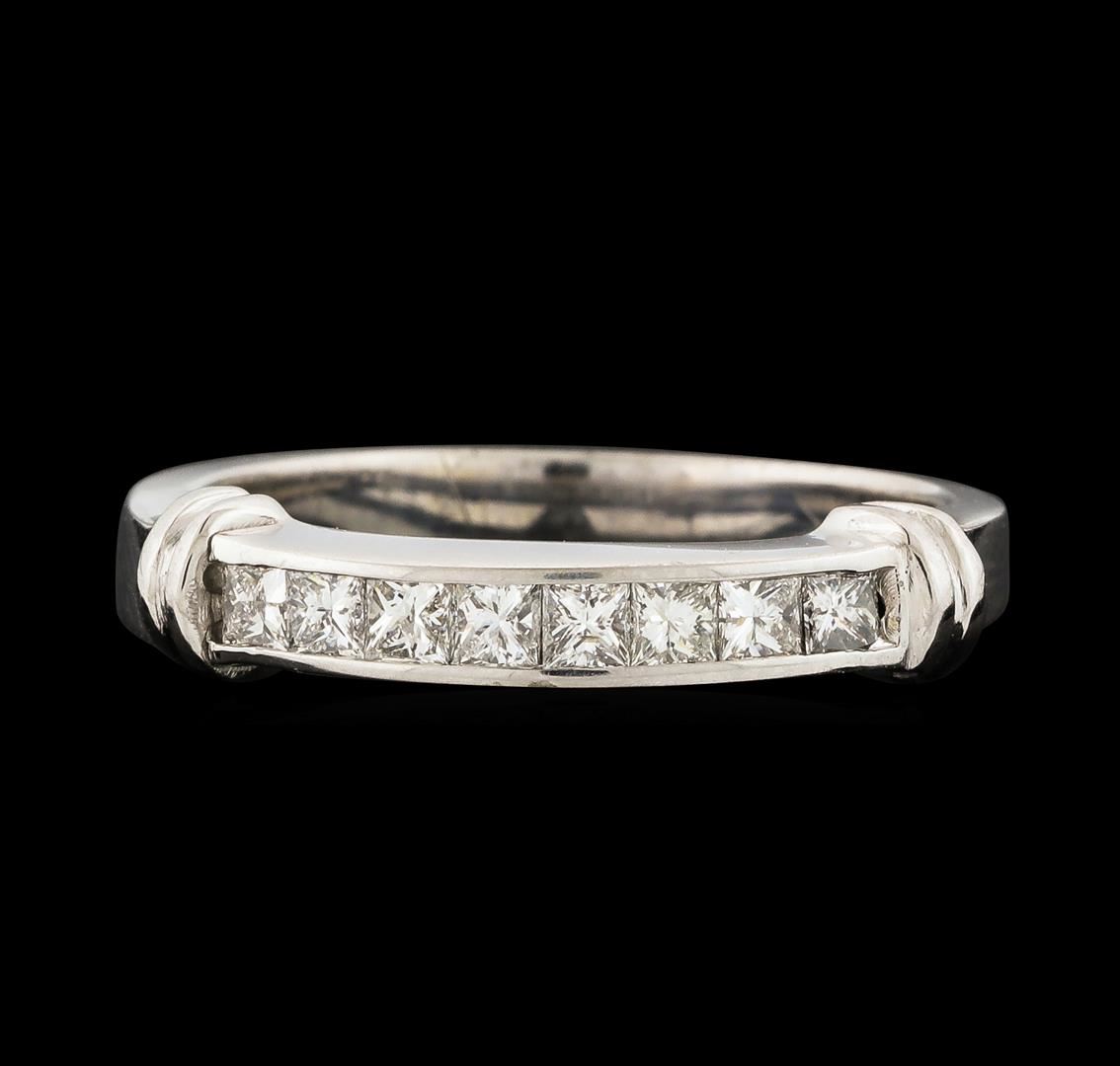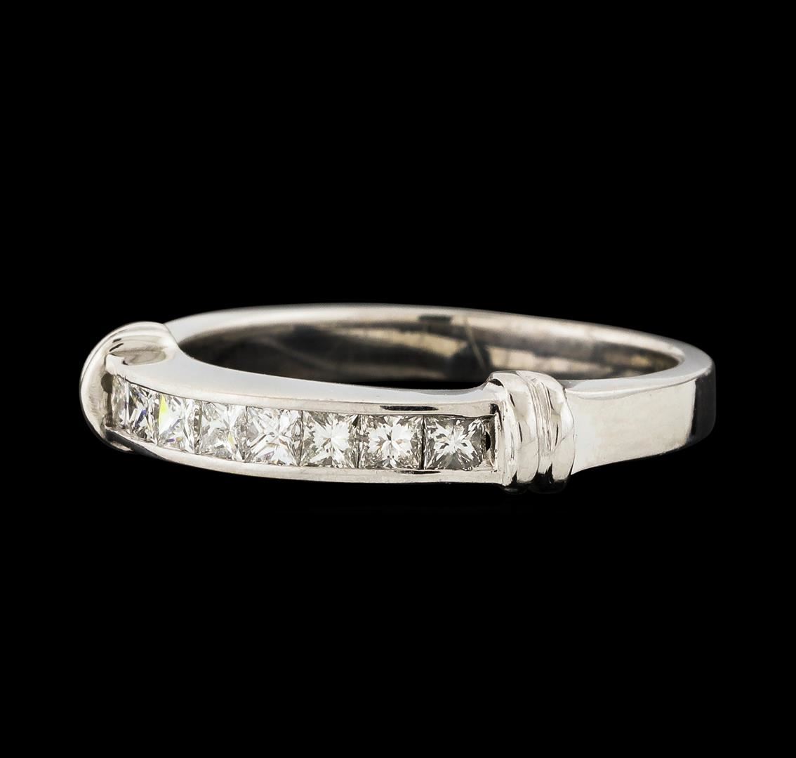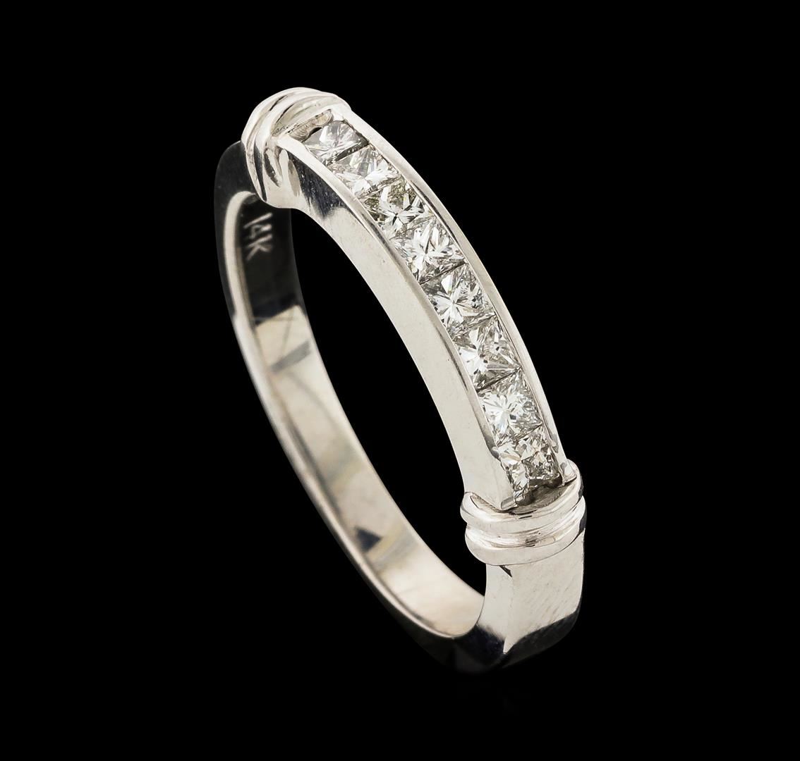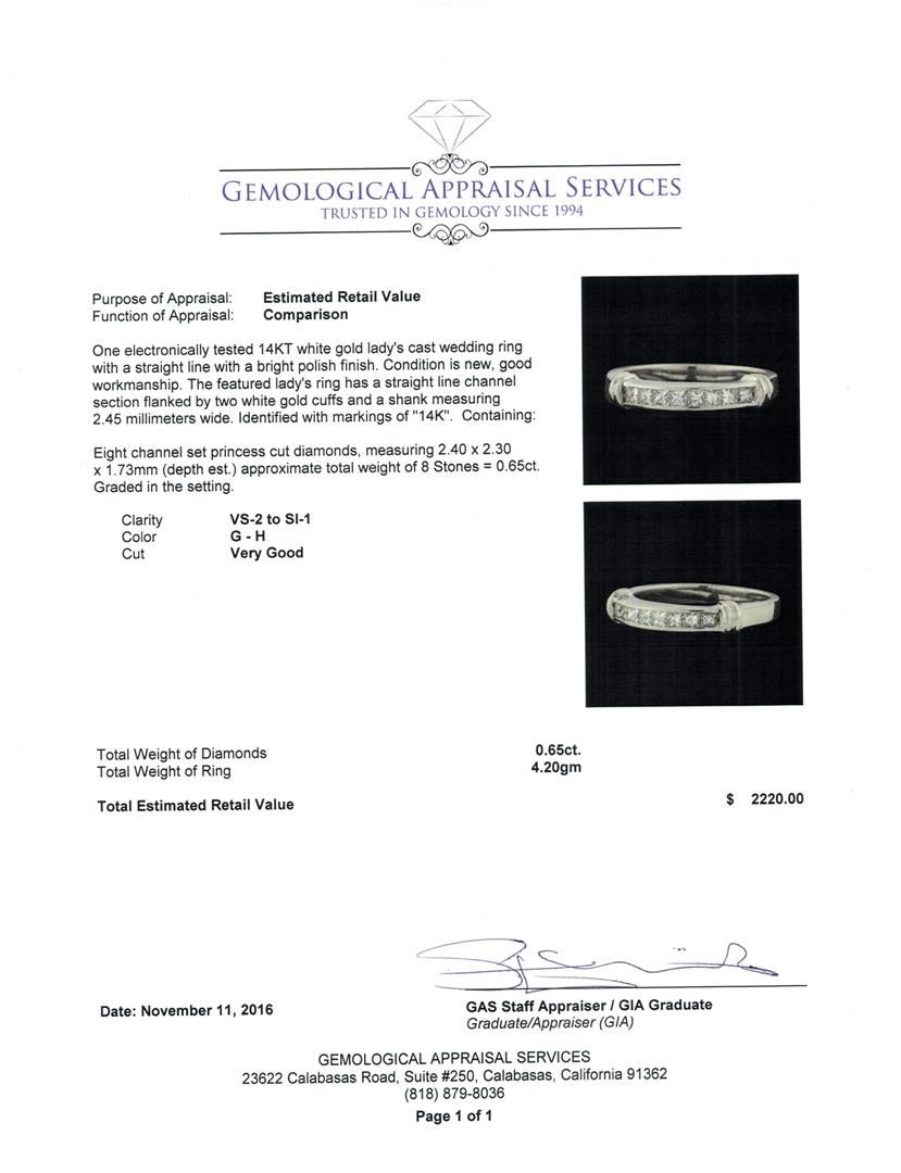 One electronically tested 14KT white gold lady's cast wedding ring with a straight line with a bright polish finish. The featured lady's ring has a straight line channel section flanked by two white gold cuffs and a shank measuring 2.45 millimeters wide. Identified with markings of '14K'. Condition is new, good workmanship. Containing: Eight channel set princess cut diamonds, measuring 2.40 x 2.30 x 1.73mm (depth est.) approximate total weight of 8 Stones = 0.65ct. Graded in the setting. Clarity VS-2 to SI-1. Color: G - H Cut Very Good. Total Weight of Diamonds 0.65ct.. Total Weight of Ring 4.20gm GAS Appraised at $2,220.00.