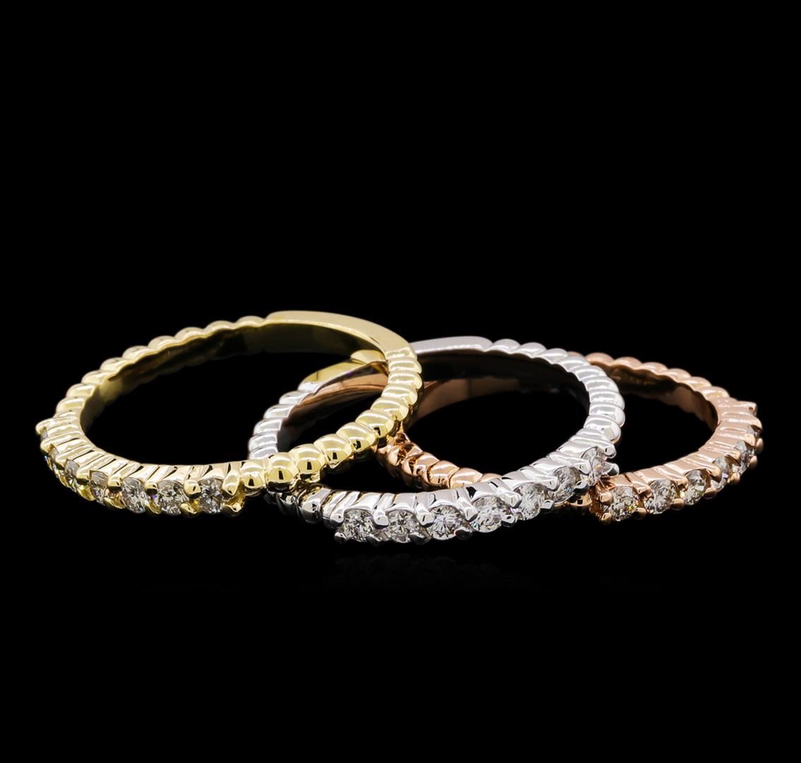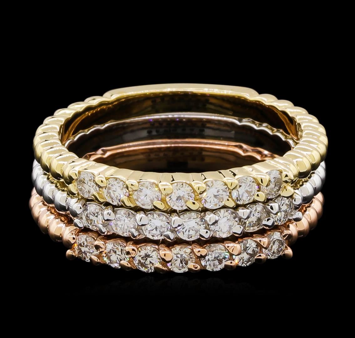 One set of three stackable rings featuring: 14KT yellow, white, and rose gold weighing 6.78 grams containing diamonds with a total weight of 0.65ct.