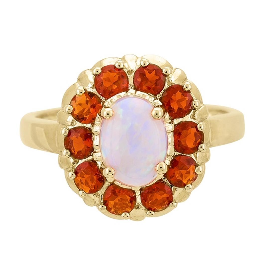 One Australian Opal and Fire Opal Ring featuring: 14KT Yellow Gold with a total weight of 3.16 grams, Australian Opal with a total weight of 0.65ct and 10 Fire Opal Stones with a total weight of 0.75ctw.
