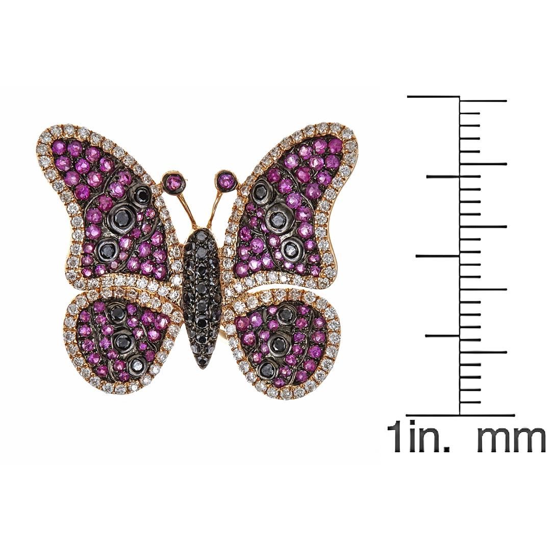 One lady's butterfly ring featuring: 18KT rose gold weighing 7.53 grams containing rubies weighing 0.65ctw, black diamonds weighing 0.30ctw and white diamonds weighing 0.50ctw.