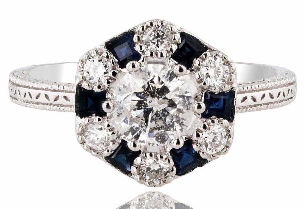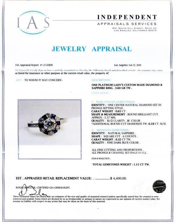 Description: one platinum lady's custom made diamond & sapphire ring. 3.60 gr tw. Containing : 1 - main center gemstone(s) : identity : one center natural diamond set in prongs setting style. Carat weight : 0.65 ct. Shape & measurememt : round brilliant cut. Approx : 5.37 mm. Quality : i1/ i2 clarity, h color. *additional round cut diamonds tw: 0.18 ct. Si/h. 2 - adjacent gemstones : identity : natural sapphire. Shape : square cut. 6 counts. Carat weight : 0.32 ctw tw. Quality : fine dark blue color. All fine cutting and proportions. All prongs & channel settings style. Total gemstones weight : 1.15 ctw tw.