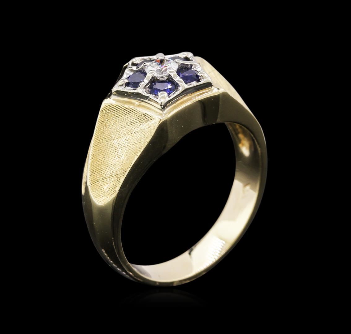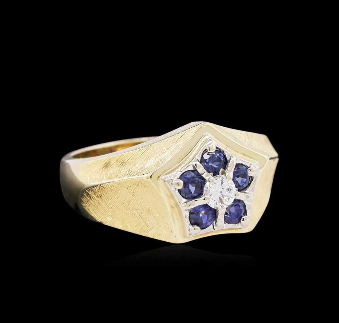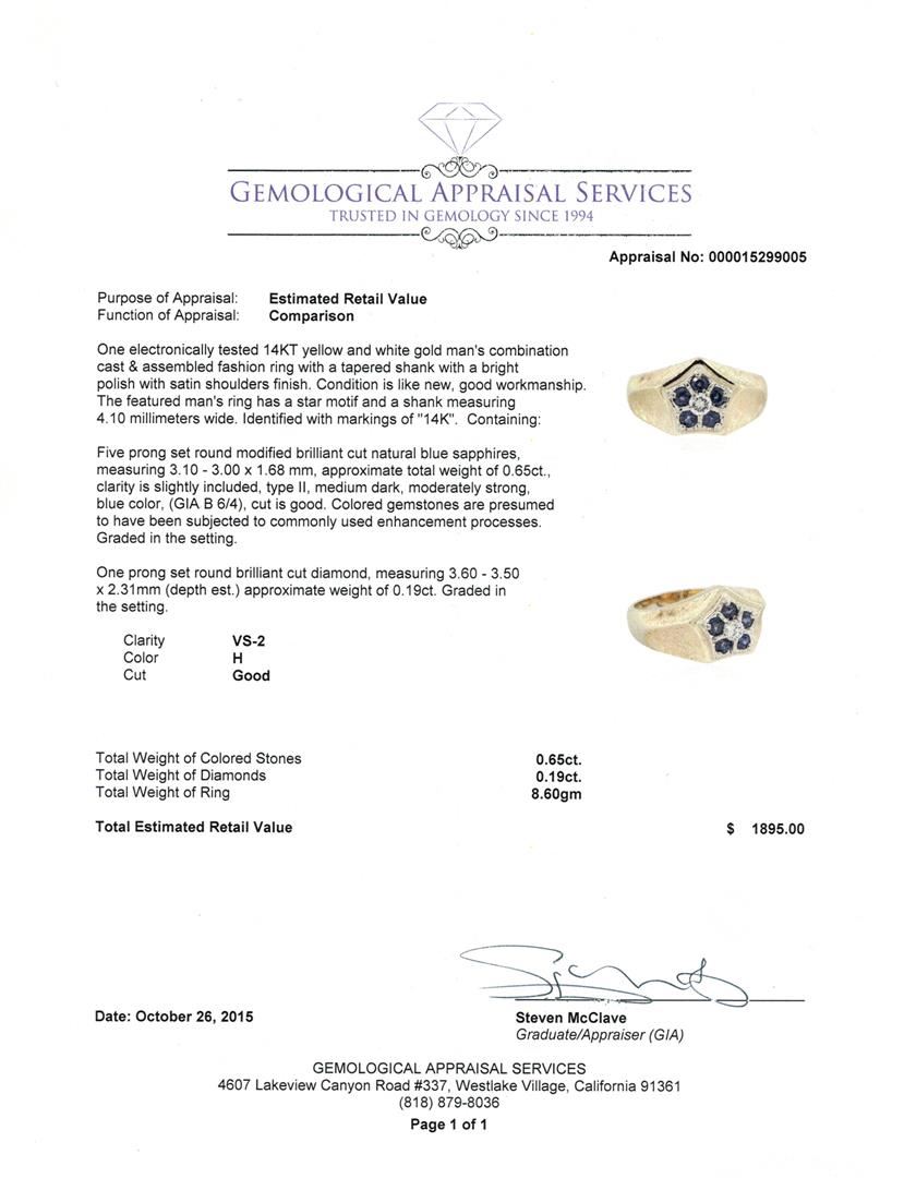 One electronically tested 14KT yellow and white gold man's combination cast & assembled fashion ring with a tapered shank with a bright polish with satin shoulders finish. The featured man's ring has a star motif and a shank measuring 4.10 millimeters wide. Identified with markings of "14K". Condition is like new, good workmanship. Containing: Five prong set round modified brilliant cut natural blue sapphires, measuring 3.10 - 3.00 x 1.68 mm, approximate total weight of 0.65ct., clarity is slightly included, type II, medium dark, moderately strong, blue color, (GIA B 6/4), cut is good. Colored gemstones are presumed to have been subjected to commonly used enhancement processes. Graded in the setting. One prong set round brilliant cut diamond, measuring 3.60 - 3.50 x 2.31mm (depth est.) approximate weight of 0.19ct. Graded in the setting. Clarity: VS-2. Color: Good. Total Weight of Colored Stones 0.65ct. Total Weight of Diamonds 0.19ct. Total Weight of Ring 8.60gm. GAS Appraised at $1,895.00.