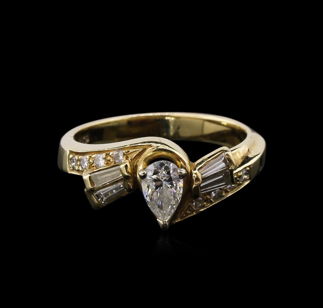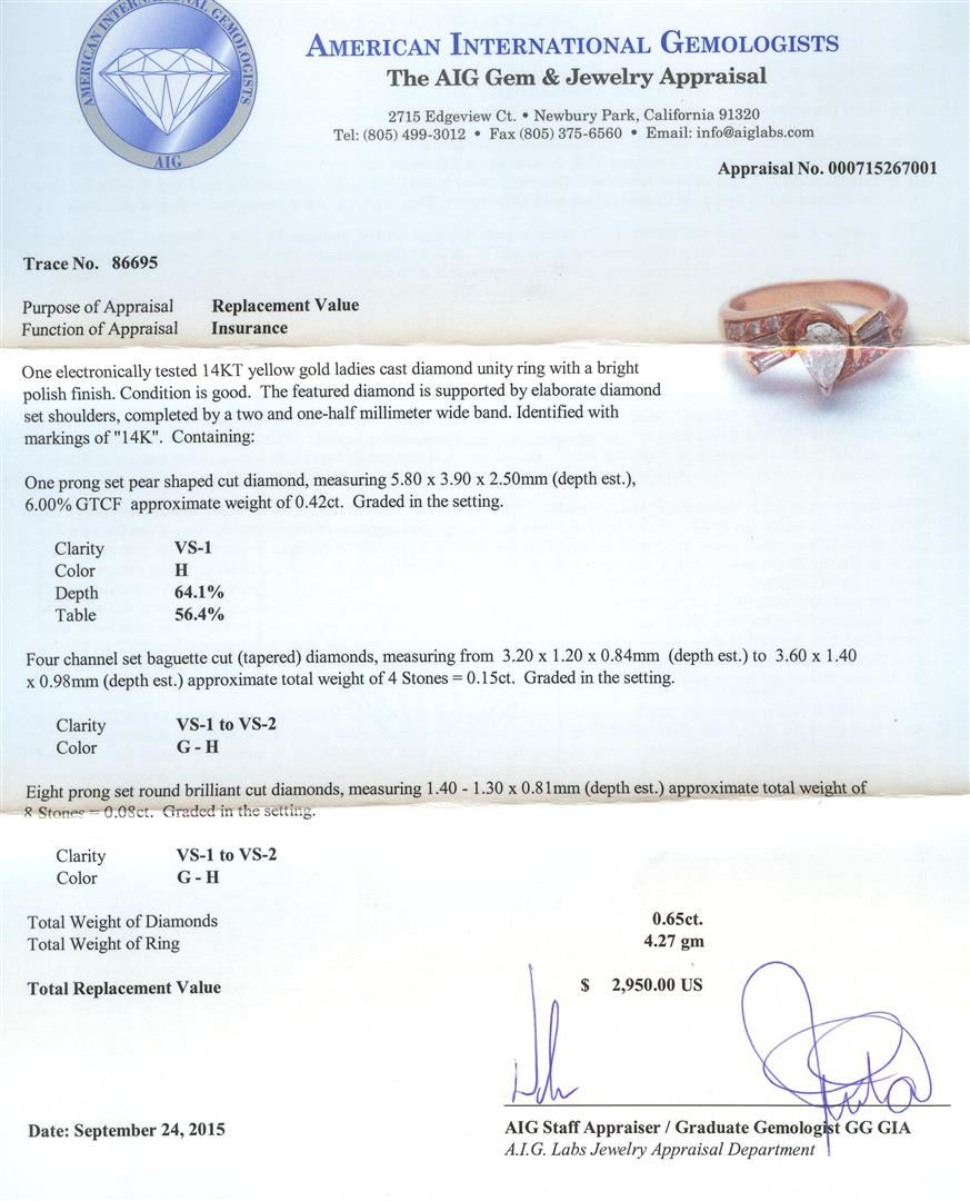 One electronically tested 14KT yellow gold ladies cast diamond unity ring with a bright polish finish. Condition is good. The featured diamond is supported by elaborate diamond set shoulders, completed by a two and one-half millimeter wide band. Identified with markings of "14K." Containing: One prong set pear shaped cut diamond, measuring 5.80 x 3.90 x 2.50mm (depth est.), 6.00% GTCF approximate weight of 0.42ct. Graded in the setting. Clarity: VS-1. Color: H. Depth: 64.1%. Table: 56.4%. Four channel set baguette cut (tapered) diamonds, measuring from 3.20 x 1.20 x 0.84mm (depth est.) to 3.60 x 1.40 x 0.98mm (depth est.) approximate total weight of 4 stones = 0.15ct. Graded in the setting. Clarity: VS-1 to VS-2. Color: G-H. Eight prong set round brilliant cut diamonds, measuring 1.40 - 1.30 x 0.81mm (depth est.) approximate total weight of 8 stones = 0.08ct. Graded in the setting. Clarity: VS-1 to VS-2. Color: G-H. Total Weight of Diamonds: 0.65ct. Total Weight of Ring: 4.27 grams. AIG Appraised at $2,950.00.