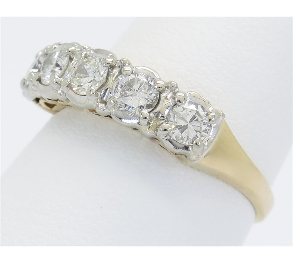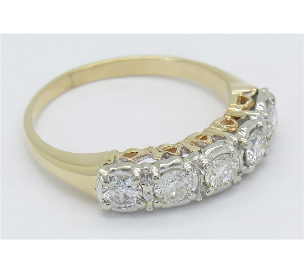 One tested 14K gold diamond ring. Containing: 5 Round Brilliant Cut Diamonds. Clarity: I-SI. Color: G-I. Approximate total diamond weight: .65CTW. Diamonds are graded in the mounting, unless otherwise stated. Weight: 3.1 grams. Size: 7.00