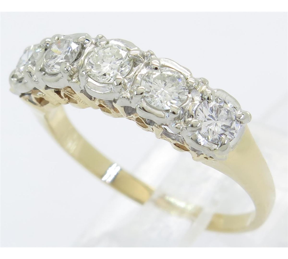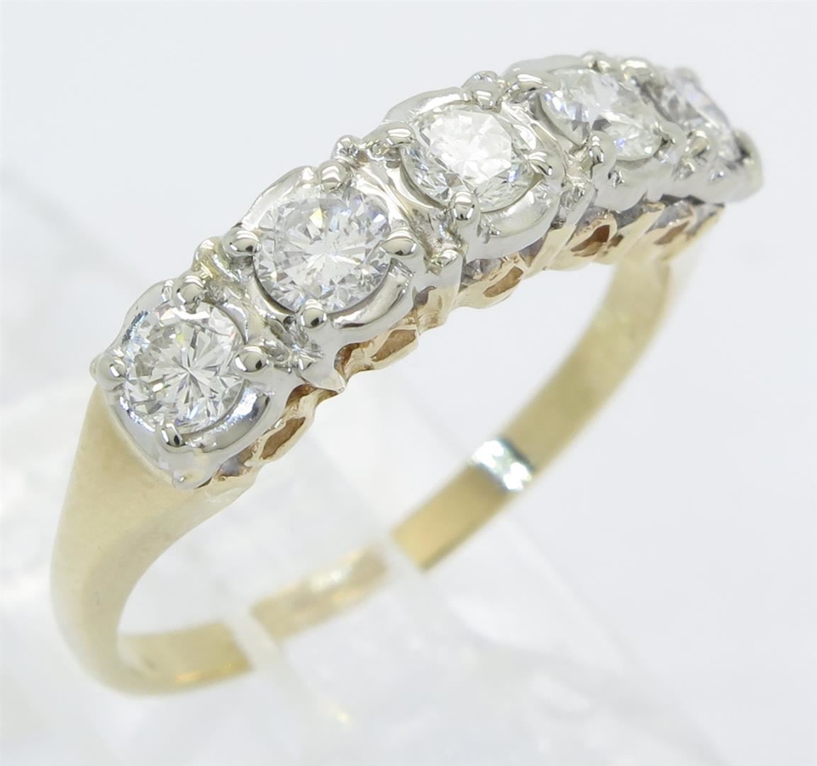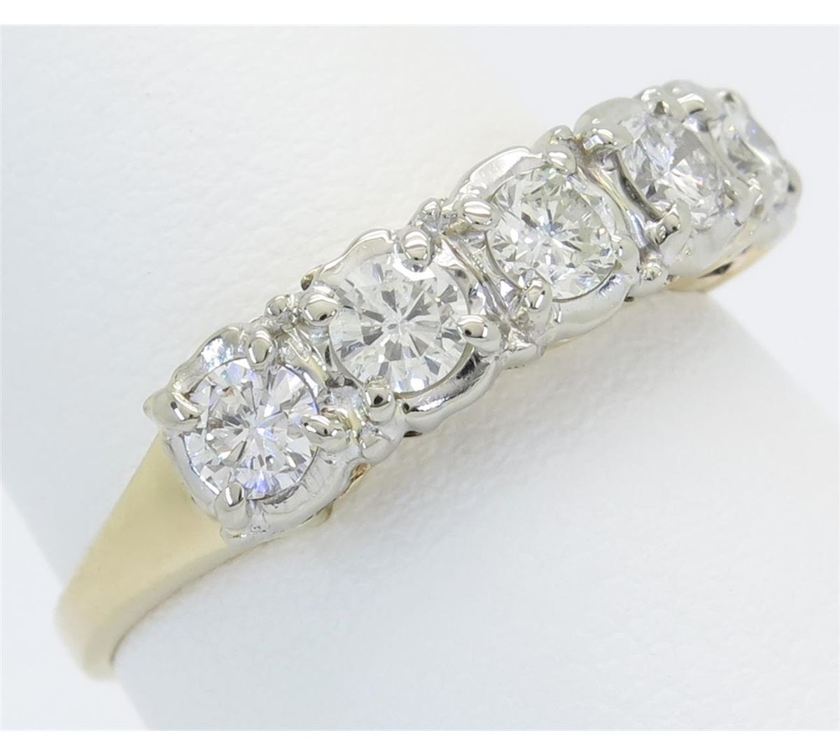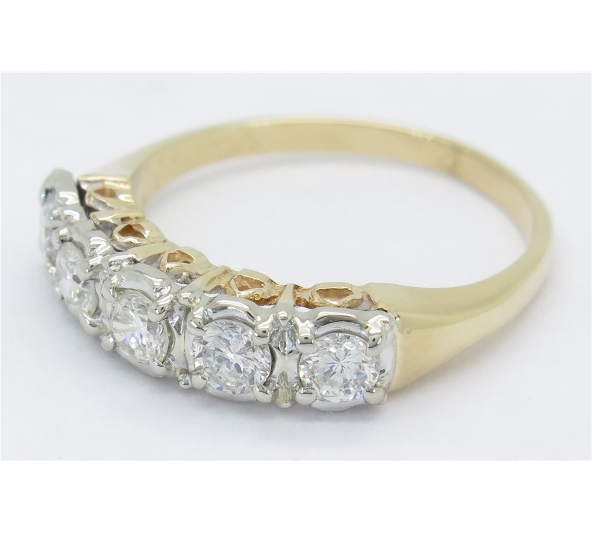 One tested 14K gold diamond ring. Containing: 5 Round Brilliant Cut Diamonds. Clarity: I-SI. Color: G-I. Approximate total diamond weight: .65CTW. Diamonds are graded in the mounting, unless otherwise stated. Weight: 3.1 grams. Size: 7.00