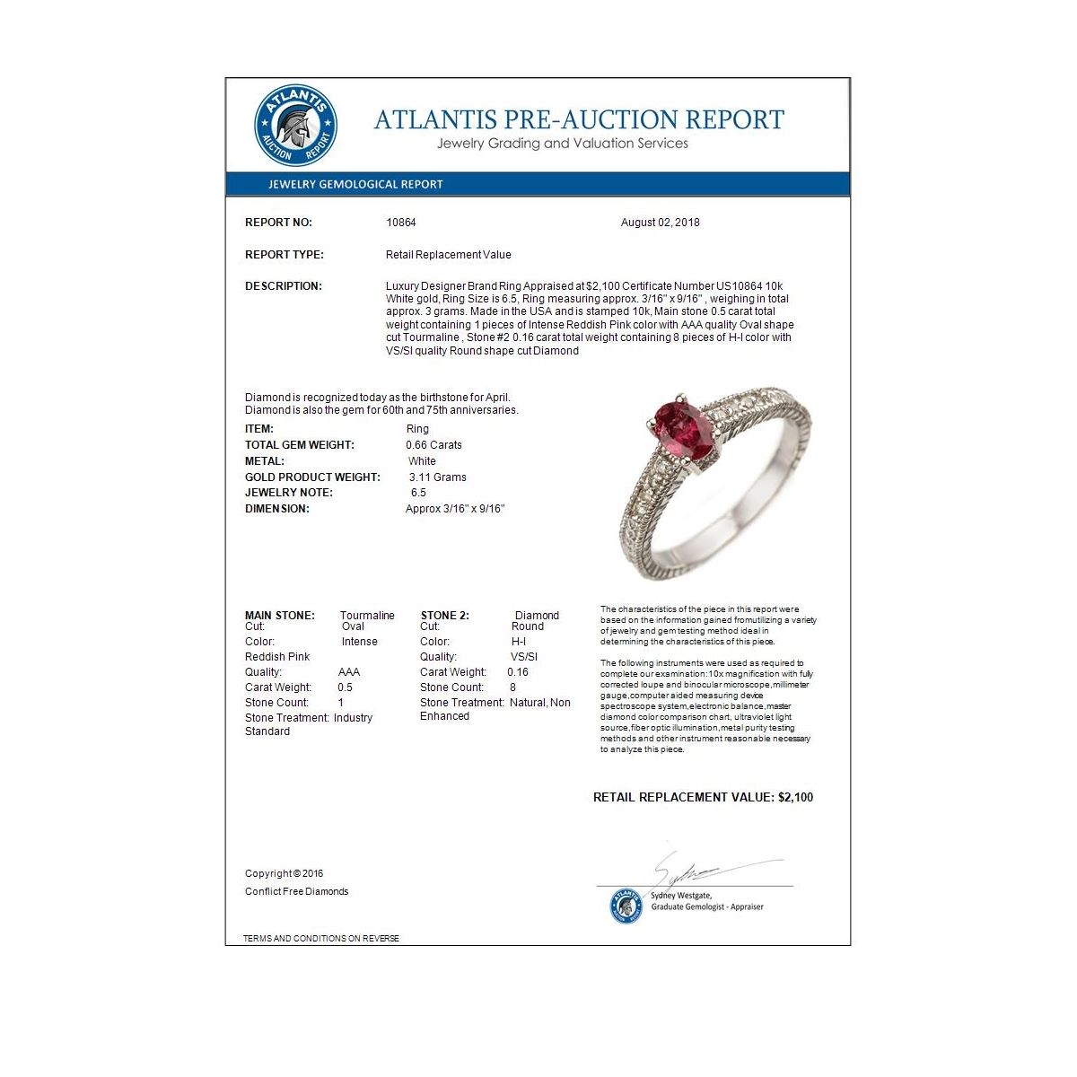 REF-27X5T -10864 ---- 0.66 CTW Pink Tourmaline & Diamond Ring 10K White Gold ---- Luxury Designer Brand Ring Appraised at $2,100 Certificate Number US10864  10k White gold,  Ring Size is 6.5, Ring measuring approx. 3/16" x  9/16" , weighing in total approx. 3 grams. Made in the USA and is stamped 10k, Main stone 0.5 carat total weight containing 1 pieces of Intense Reddish Pink color with AAA quality Oval shape cut Tourmaline , Stone #2 0.16 carat total weight containing 8 pieces of H-I color with  VS/SI quality Round shape cut Diamond