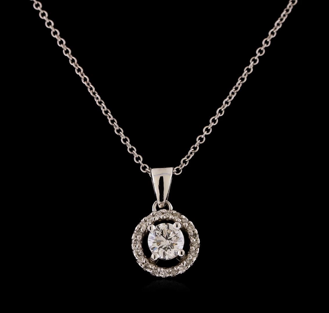 One electronically tested 14KT white gold lady's combination cast & assembled fashion pendant & chain 18.0' long, 1.3mm round cable link with a lobster claw clasp with a halo with a bright polish finish. Identified with markings of '14K'. Condition is new, good workmanship. Containing: One prong set round brilliant cut diamond, measuring 5.08 - 5.06 x 3.30mm (depth est.) approximate weight of 0.52ct. Graded in the setting. Clarity I-1. Color: G Cut Very Good Twenty prong set round brilliant cut diamonds, measuring 1.30 - 1.20 x 0.75mm (depth est.) approximate total weight of 20 Stones = 0.14ct. Graded in the setting. Clarity SI-1 to SI-2. Color: H - I Cut Good. Total Weight of Diamonds 0.66ct.. Total Weight of Pendant & Chain 3.40gm. GAS Appraised at $4,000.00.