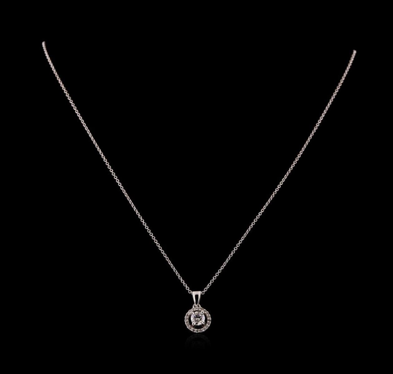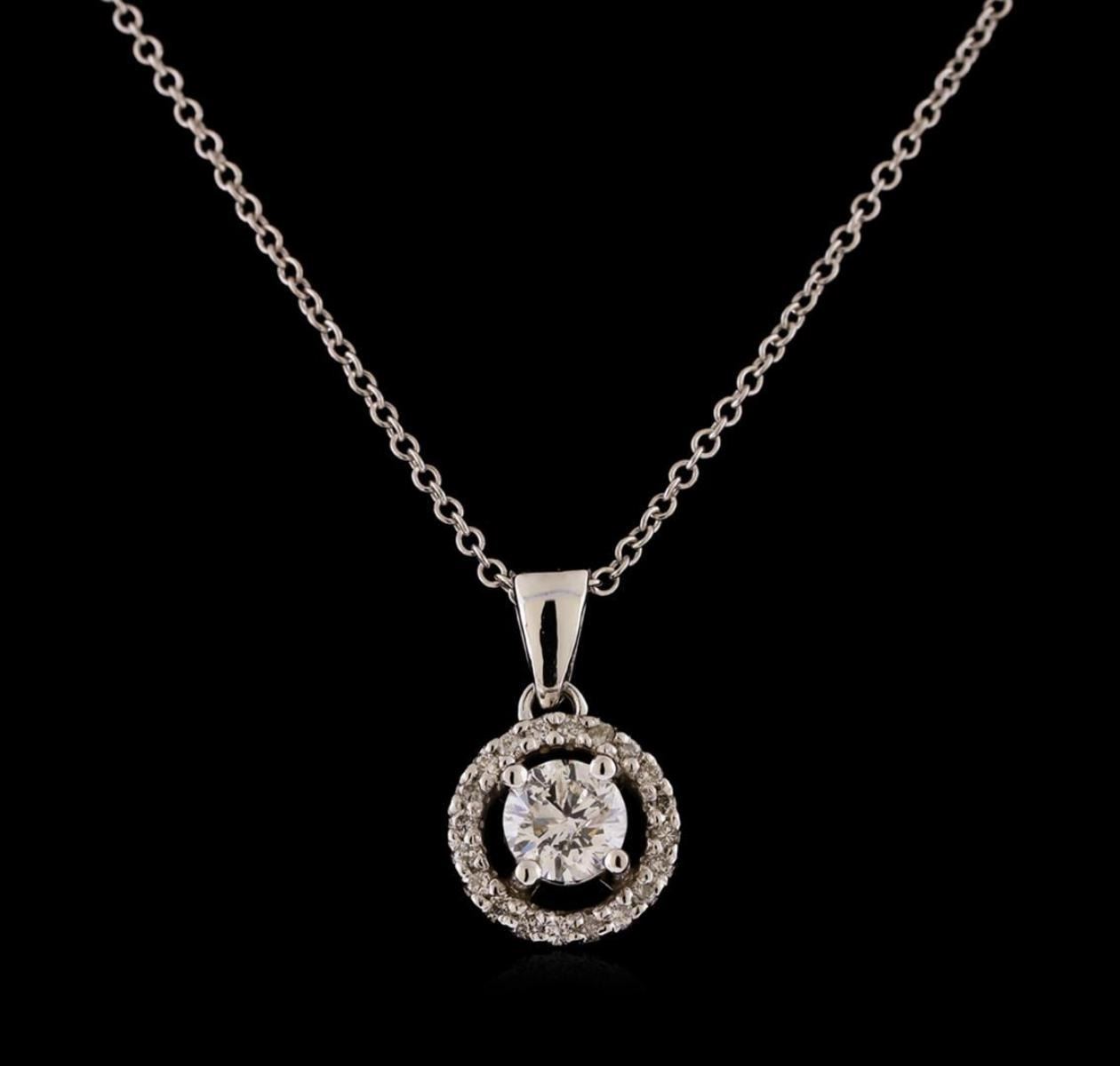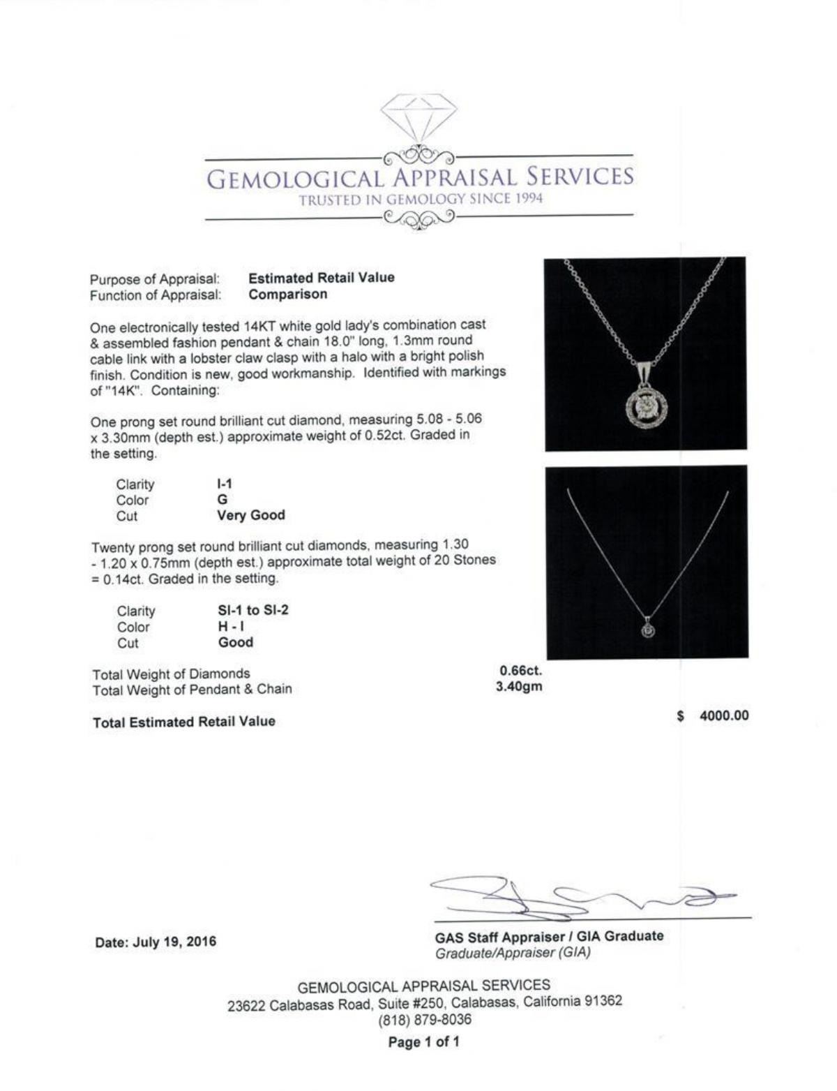 One electronically tested 14KT white gold lady's combination cast & assembled fashion pendant & chain 18.0' long, 1.3mm round cable link with a lobster claw clasp with a halo with a bright polish finish. Identified with markings of '14K'. Condition is new, good workmanship. Containing: One prong set round brilliant cut diamond, measuring 5.08 - 5.06 x 3.30mm (depth est.) approximate weight of 0.52ct. Graded in the setting. Clarity I-1. Color: G Cut Very Good Twenty prong set round brilliant cut diamonds, measuring 1.30 - 1.20 x 0.75mm (depth est.) approximate total weight of 20 Stones = 0.14ct. Graded in the setting. Clarity SI-1 to SI-2. Color: H - I Cut Good. Total Weight of Diamonds 0.66ct.. Total Weight of Pendant & Chain 3.40gm. GAS Appraised.