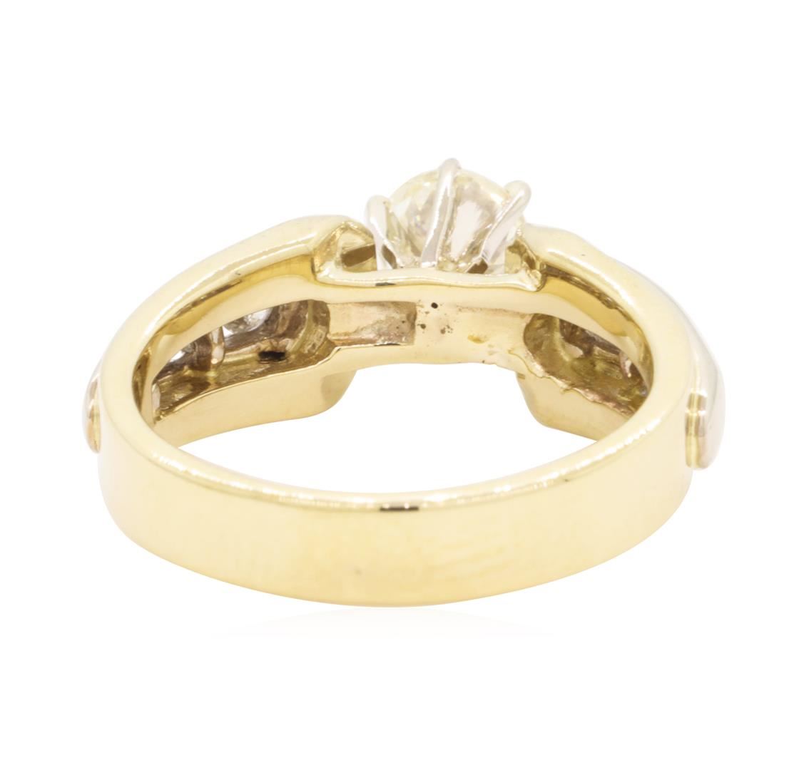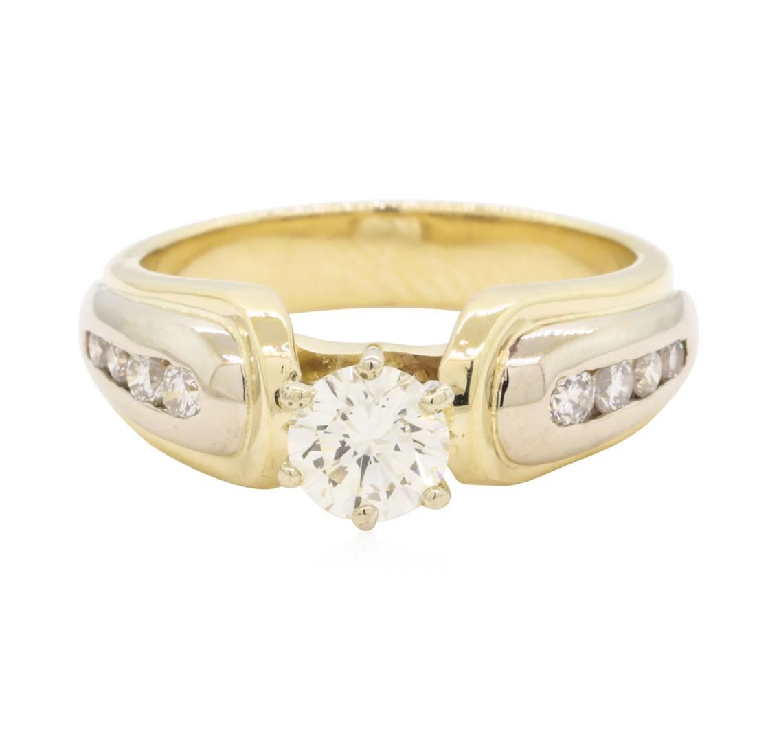 One electronically tested 14KT yellow and white gold lady's combination cast & assembled wedding ring with a cathedral solitaire with a bright polish finish. This featured lady's ring has a shank measuring 3.97 millimeters in width. Identified with markings of '14K'. Condition is new, good workmanship. Containing: Eight channel set round brilliant cut diamonds, measuring 2.30 - 1.80 x 1.27mm (depth est.) approximate total weight of 8 Stones = 0.27ct. Graded in the setting. Color H - I Clarity SI-1 to SI-2 Cut Good One prong set round brilliant cut diamond, measuring 5.50 - 5.46 x 3.60mm (depth est.) approximate weight of 0.66ct. Graded in the setting. Color J Clarity VS-2 Cut Good. Total Weight of Diamonds 0.93ct.. Total Weight of Ring 6.40gm GAS Appraised at $3980.00. GAS Appraised.