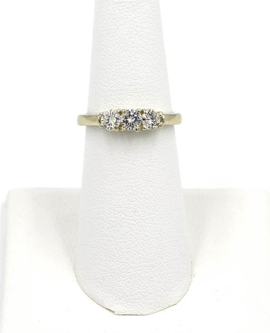 One three stone ring featuring: 14KT white gold weighing 3.12 grams containing three diamonds weighing 0.66ctw. The diamonds are round brilliant cut and are natural, unenhanced stones with SI1 clarity and H-I color. The ring is a size 6 but is resizable.