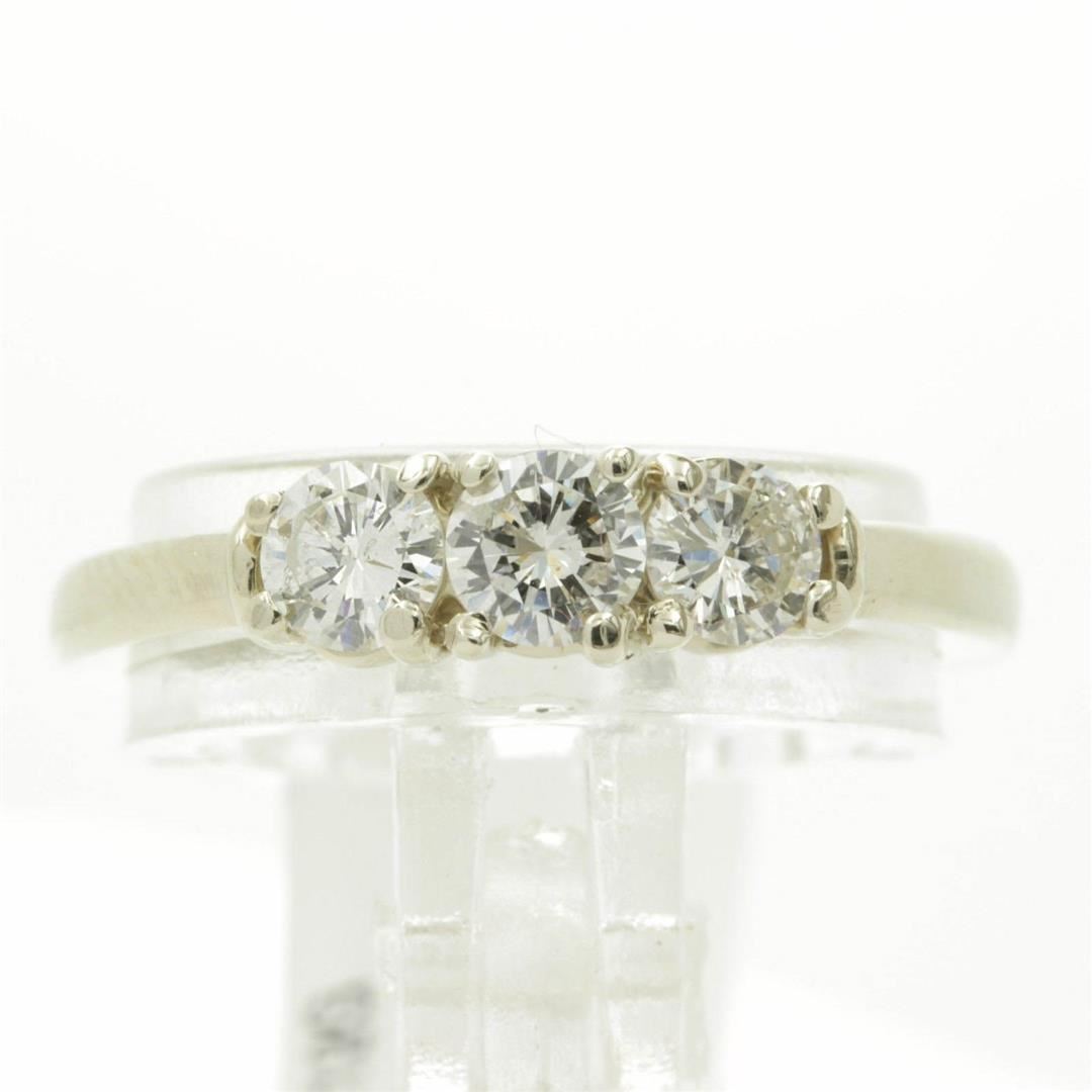 One three stone ring featuring: 14KT white gold weighing 3.12 grams containing three diamonds weighing 0.66ctw. The diamonds are round brilliant cut and are natural, unenhanced stones with SI1 clarity and H-I color. The ring is a size 6 but is resizable.