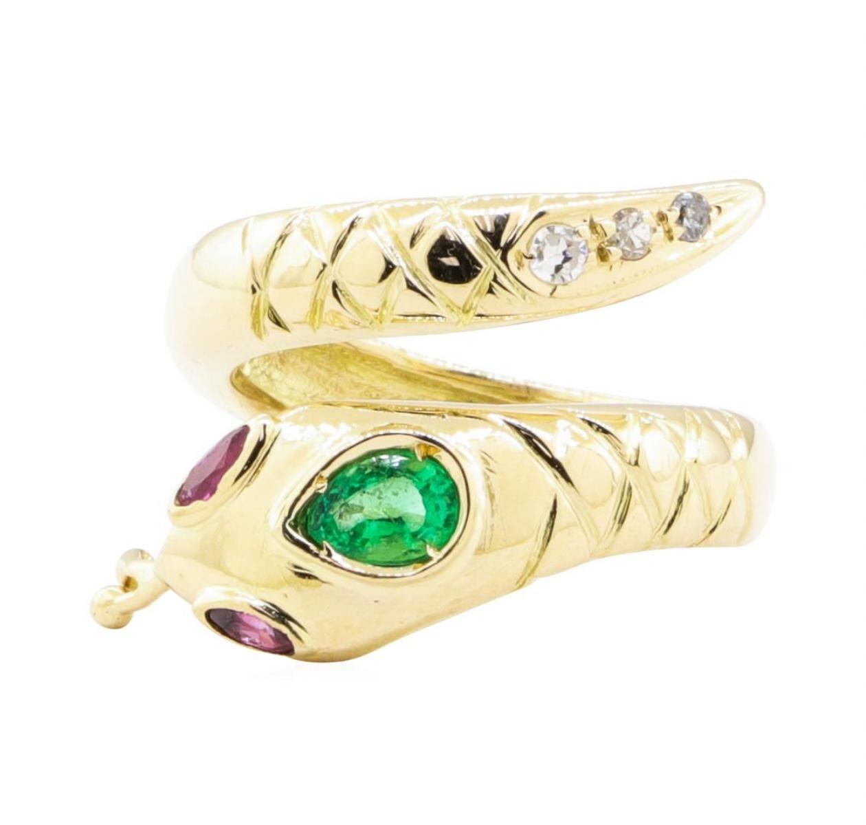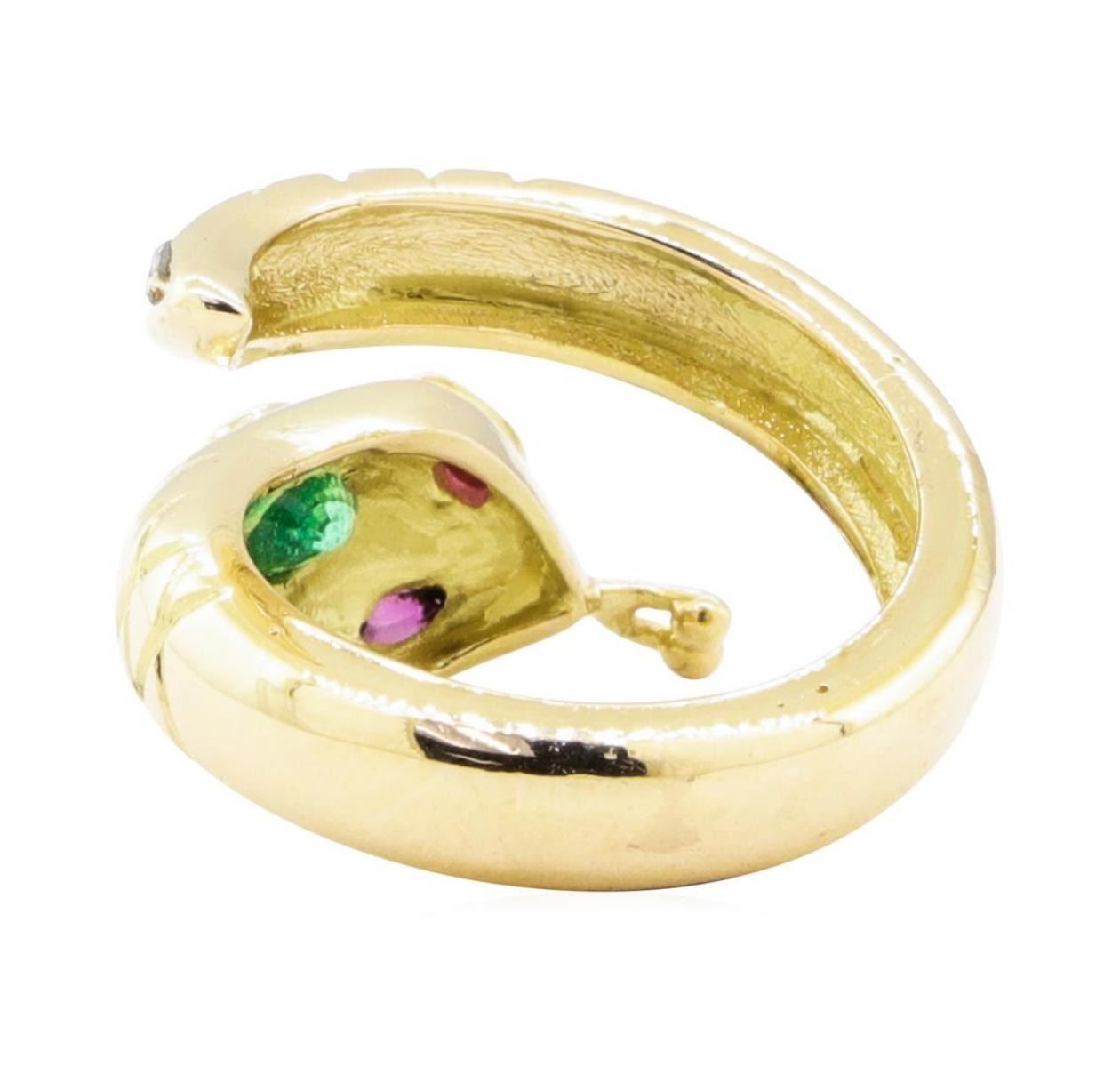 One snake ring featuring: 14KT yellow gold weighing 6.7 grams containing one emerald weighing 0.40 ct, two rubies weighing 0.20 ctw, and single cut diamonds weighing 0.06ctw.