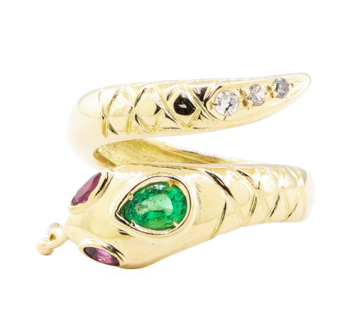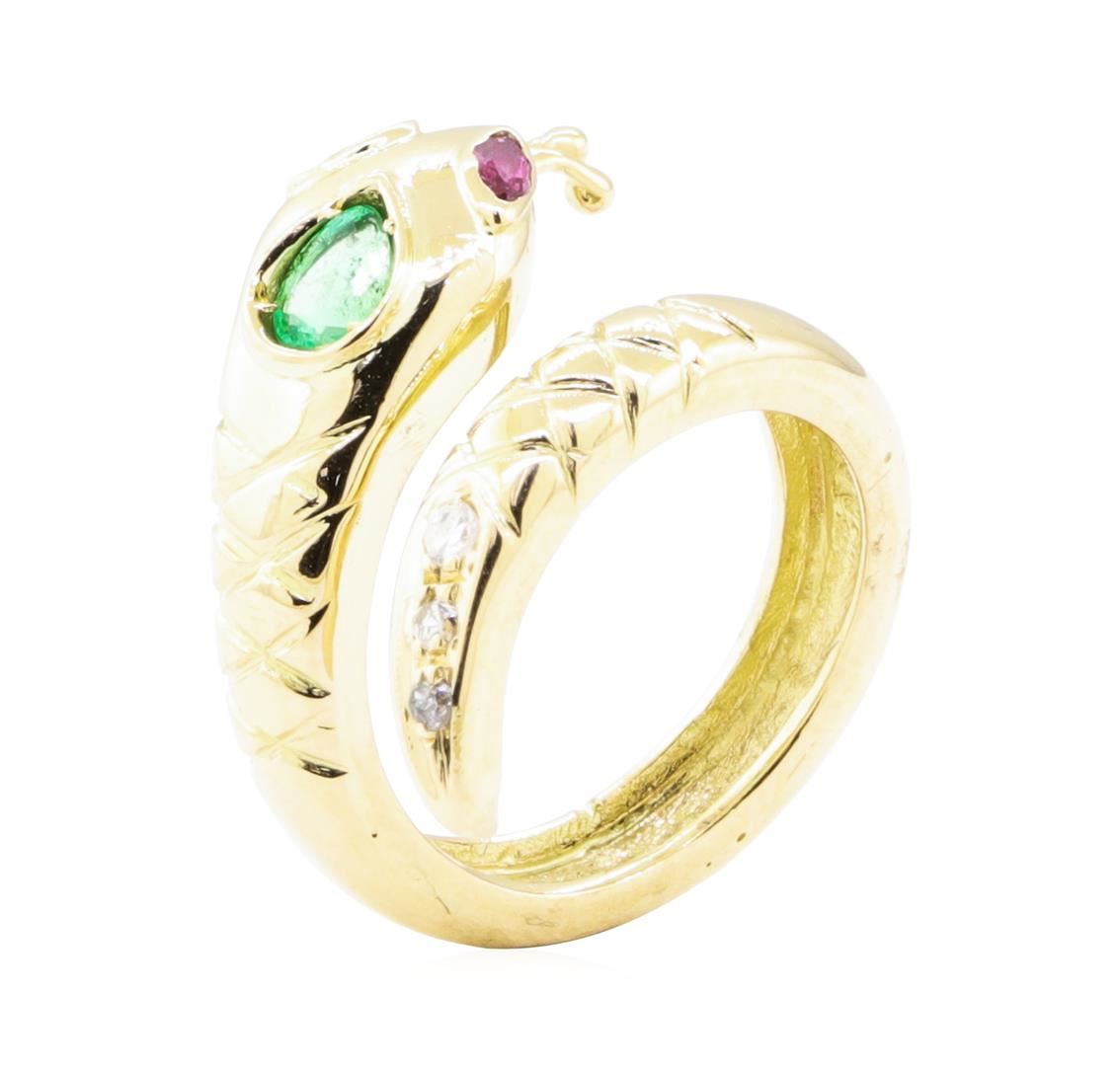 0.66 ctw Emerald, Ruby, and Diamond Snake Ring - 14KT Yellow Gold