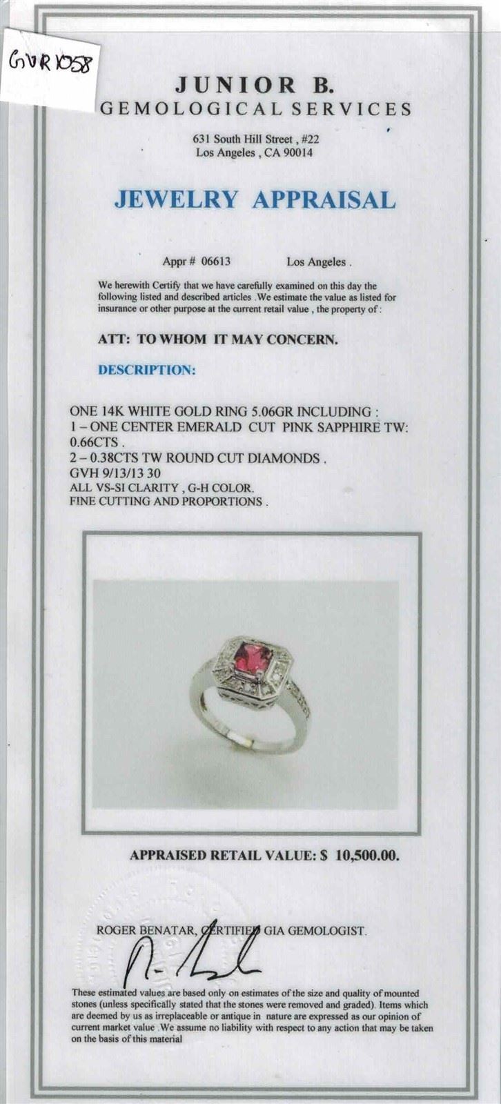 14K WHITE GOLD NATURAL CEYLON PINK SAPPHIRE RING:5.06 GRAMS/DIAMOND:0.38CT/PINK SAPPHIRE:0.66CT/#GVR1058 **Crafted in 14k white gold, a 0.66ct Emerald Cut Pink Sapphire, an ideal stone of emotional and psychic protection, brightly catches the light. A sparkling 0.38ct round cut Diamond surround adds a touch of subtle sparkle lending this cocktail ring an air of delicate beauty. **
