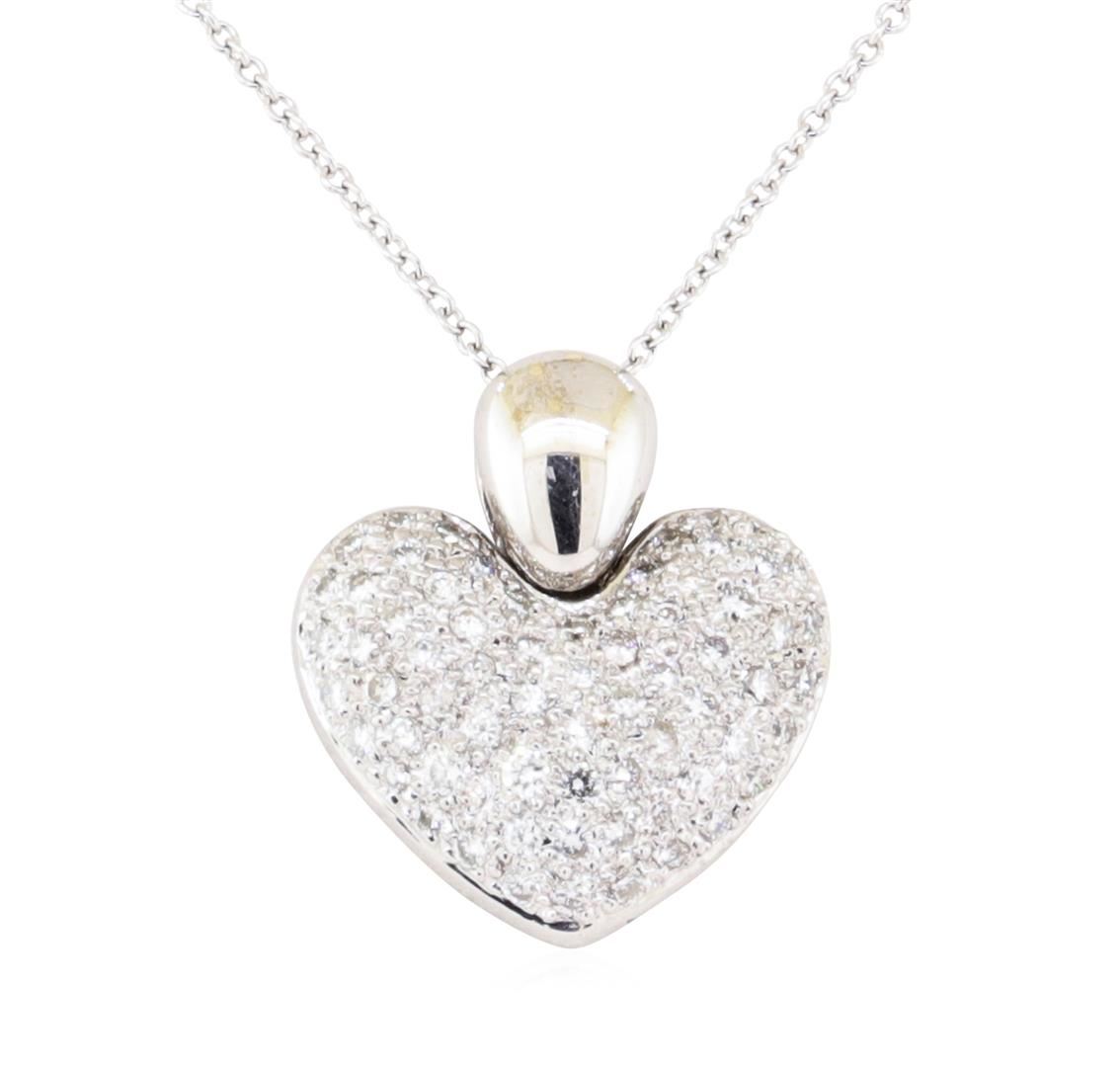 One 18KT white gold heart shaped pendant with an attached 14KT white gold 1mm rounded cable link chain measuring sixteen inches in length weighing a total of 4.0 grams containing diamonds weighing 0.67ctw.