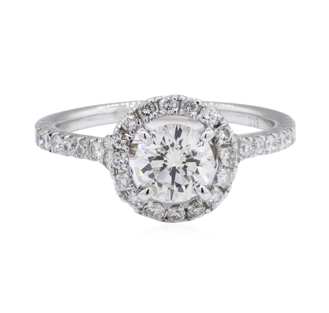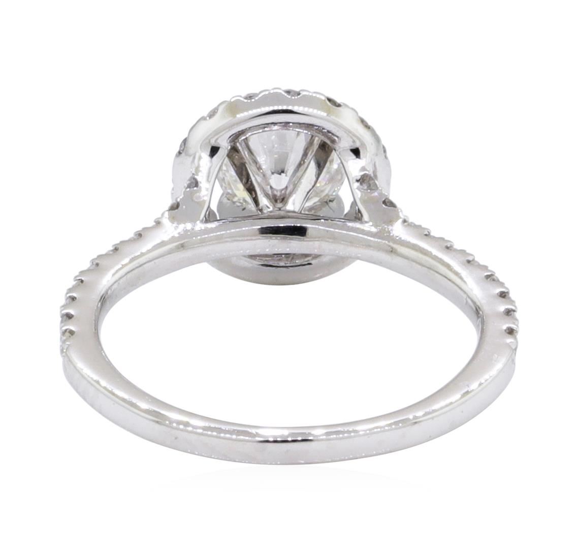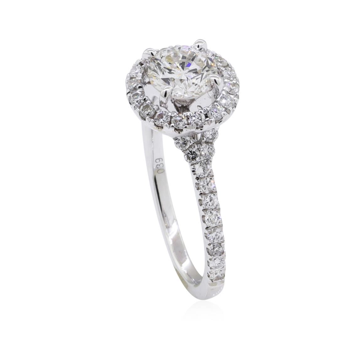 One electronically tested 14KT white gold lady's combination cast & assembled wedding ring with a cathedral halo with a bright polish finish. This featured lady's ring has a shank measuring 1.46 millimeters in width. Identified with markings of '14K 585'. Condition is new, good workmanship. Containing: One prong set round brilliant cut diamond, measuring 5.63 - 5.61 x 3.48mm (depth est.) approximate weight of 0.67ct. Graded in the setting. Color G - H Clarity SI-1 Cut Very Good Forty-One prong set round brilliant cut diamonds, measuring 1.30 - 1.25 x 0.80mm (depth est.) approximate total weight of 41 Stones = 0.33ct. Graded in the setting. Color G - H Clarity VS-2 to SI-1 Cut Very Good. Total Weight of Diamonds 1.00ct.. Total Weight of Ring 2.50gm GAS Appraised at $5970.00. GAS Appraised.