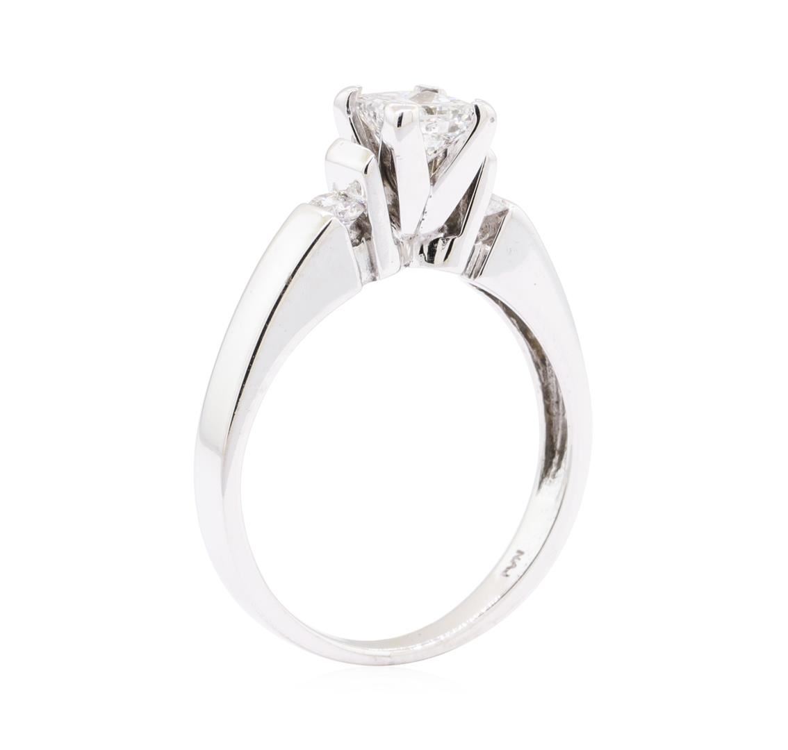 One electronically tested 14KT white gold lady's combination cast & assembled engagement ring with a tapered cathedral shank with a bright polish finish. The featured lady's ring has a shank measuring 2.10 millimeters wide. Identified with markings of '14K'. Condition is new, good workmanship. Containing: One prong set princess cut diamond, measuring 4.68 x 4.55 x 3.41mm (depth est.) approximate weight of 0.60ct. Graded in the setting. Color I Clarity SI-2 Cut Very Good Four channel set round brilliant cut diamonds, measuring 1.70 - 1.65 x 1.04mm (depth est.) approximate total weight of 4 Stones = 0.07ct. Graded in the setting. Color G - H Clarity VS-1 to VS-2 Cut Very Good. Total Weight of Diamonds 0.67ct.. Total Weight of Ring 3.40gm GAS Appraised at $3800.00. GAS Appraised at $3,800.00.
