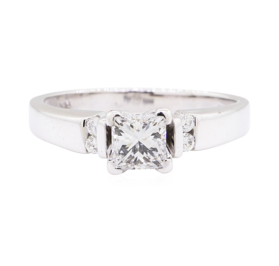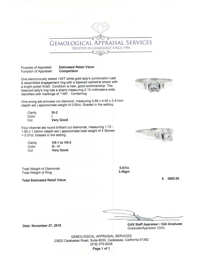 One electronically tested 14KT white gold lady's combination cast & assembled engagement ring with a tapered cathedral shank with a bright polish finish. The featured lady's ring has a shank measuring 2.10 millimeters wide. Identified with markings of '14K'. Condition is new, good workmanship. Containing: One prong set princess cut diamond, measuring 4.68 x 4.55 x 3.41mm (depth est.) approximate weight of 0.60 ct. Graded in the setting. Color I Clarity SI-2 Cut Very Good Four channel set round brilliant cut diamonds, measuring 1.70 - 1.65 x 1.04mm (depth est.) approximate total weight of 4 Stones = 0.07ct. Graded in the setting. Color G - H Clarity VS-1 to VS-2 Cut Very Good. Total Weight of Diamonds 0.67ct.. Total Weight of Ring 3.40gm GAS Appraised at $3800.00. GAS Appraised.