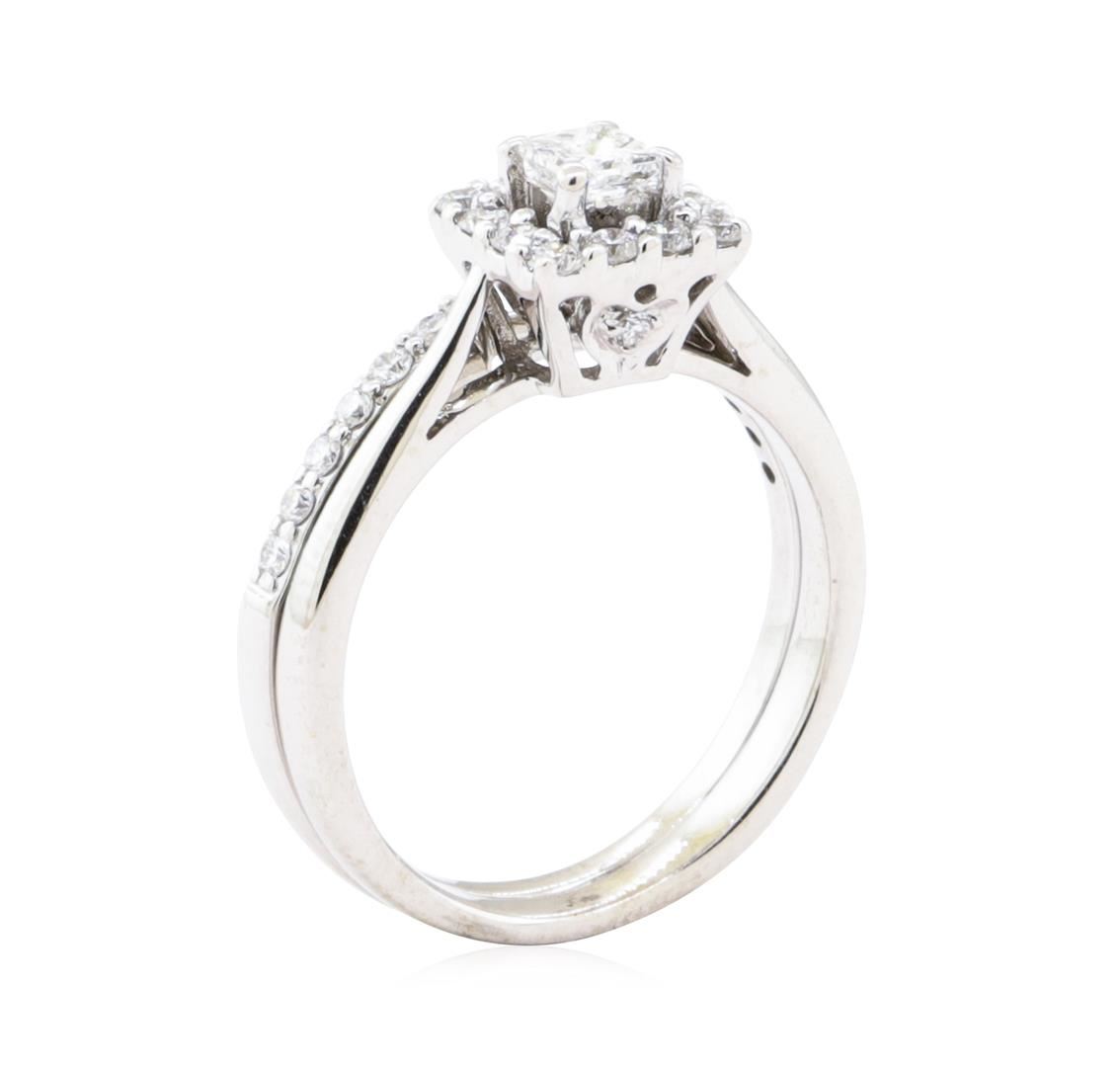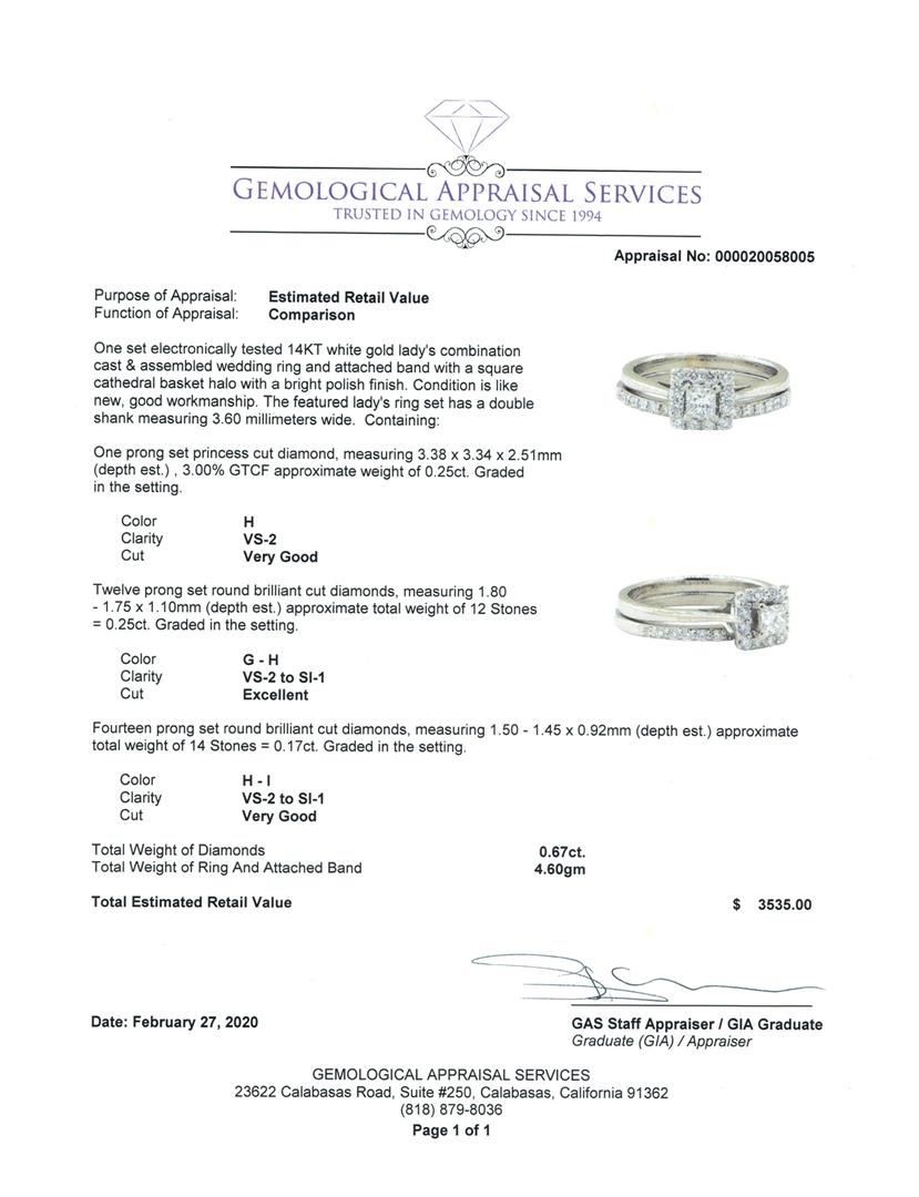 One set electronically tested 14KT white gold lady's combination cast & assembled wedding ring and attached band with a square cathedral basket halo with a bright polish finish. The featured lady's ring set has a double shank measuring 3.60 millimeters wide. Condition is Good. Containing: One prong set princess cut diamond, measuring 3.38 x 3.34 x 2.51mm (depth est.) , 3.00.%. GTCF approximate weight of 0.25ct. Graded in the setting. Color H Clarity VS-2 Cut Very Good Twelve prong set round brilliant cut diamonds, measuring 1.80 - 1.75 x 1.10mm (depth est.) approximate total weight of 12 Stones = 0.25ct. Graded in the setting. Color G - H Clarity VS-2 to SI-1 Cut Excellent Fourteen prong set round brilliant cut diamonds, measuring 1.50 - 1.45 x 0.92mm (depth est.) approximate total weight of 14 Stones = 0.17ct. Graded in the setting. Color H - I Clarity VS-2 to SI-1 Cut Very Good. Total Weight of Diamonds 0.67ct.. Total Weight of Ring And Attached Band 4.60gm GAS Appraised at $3535.00. GAS Appraised.