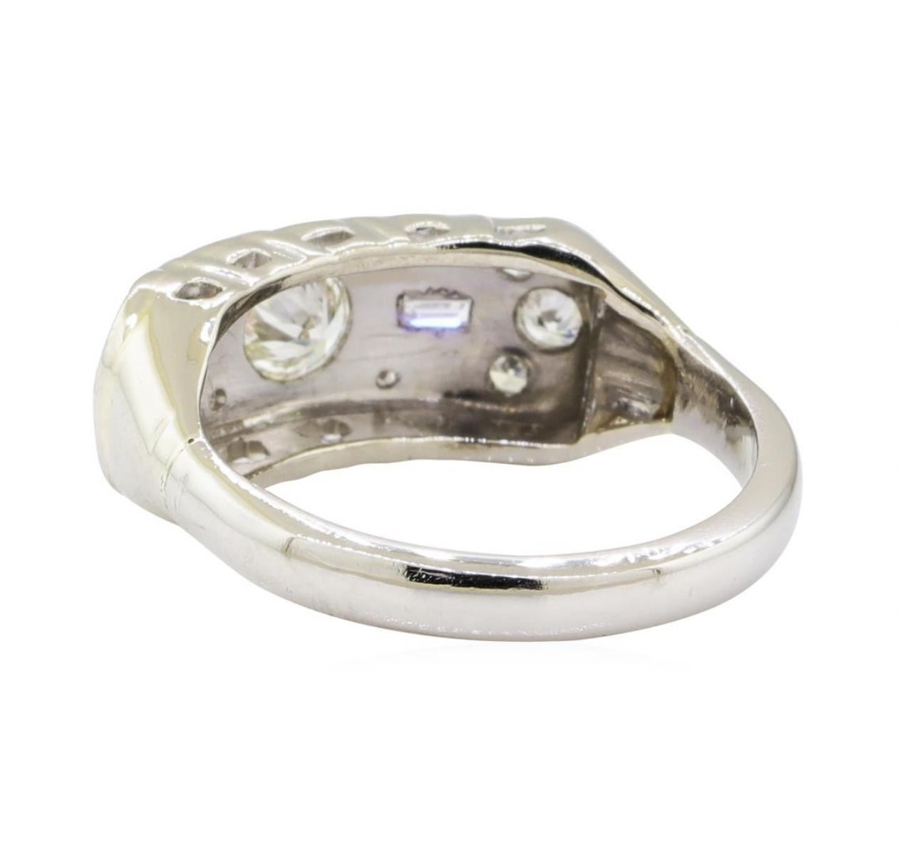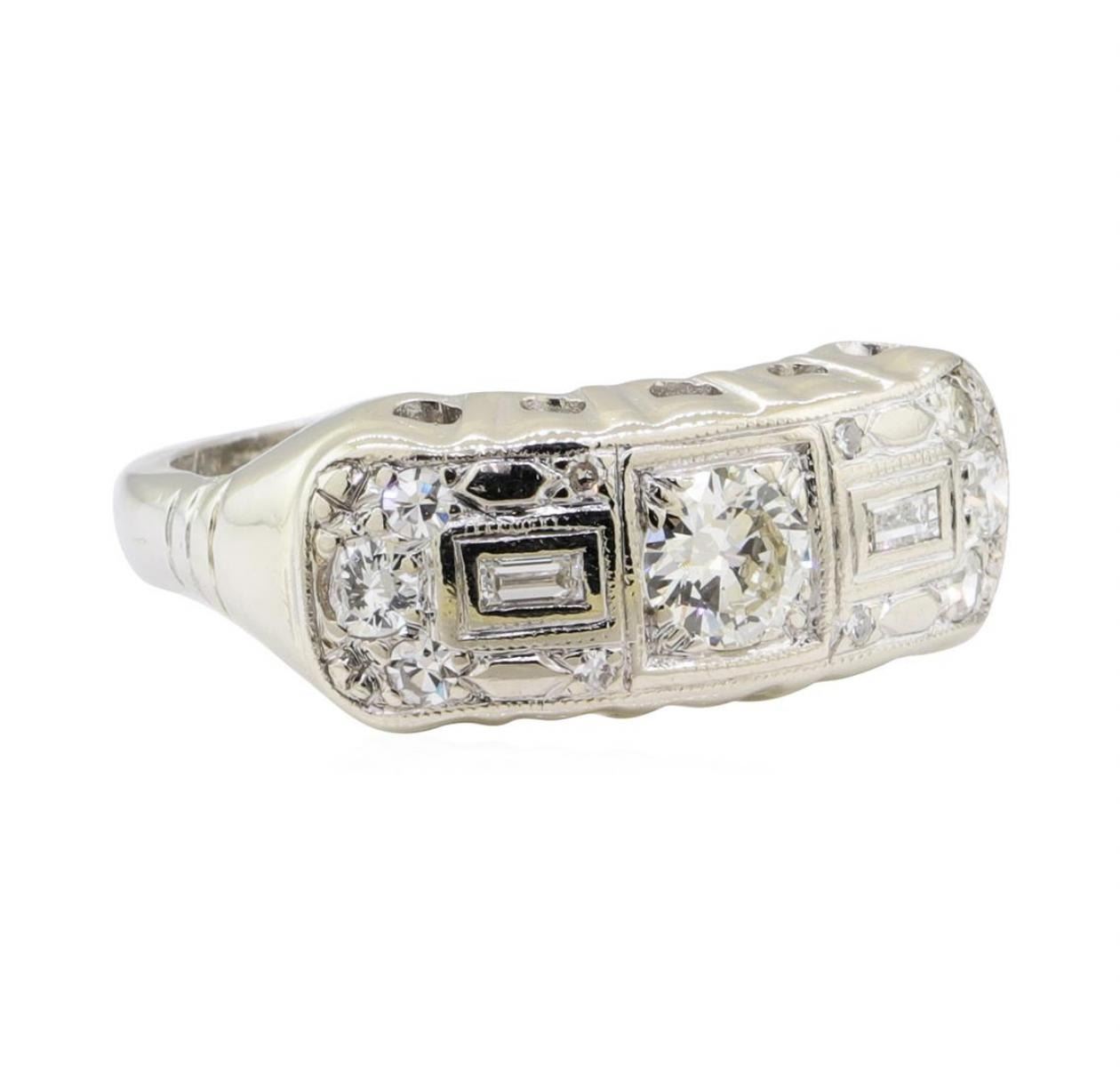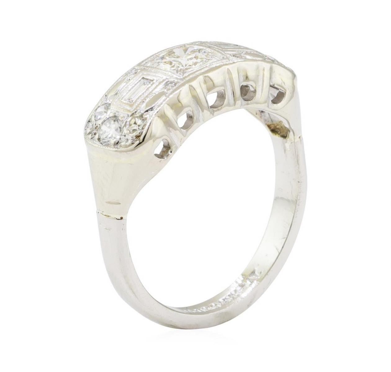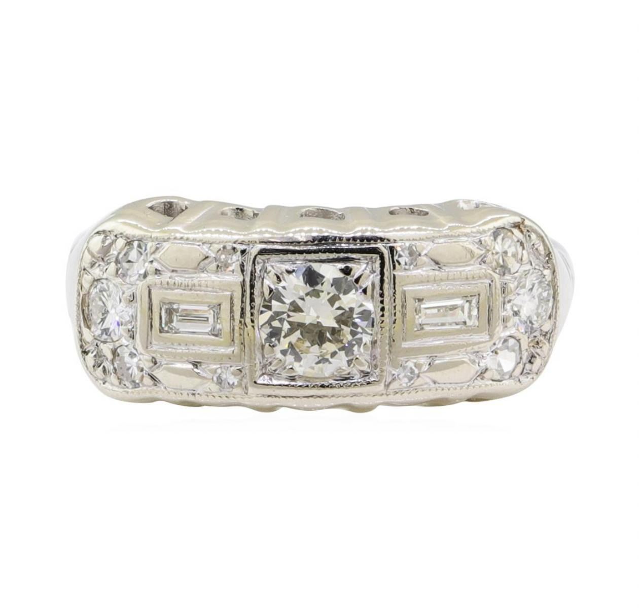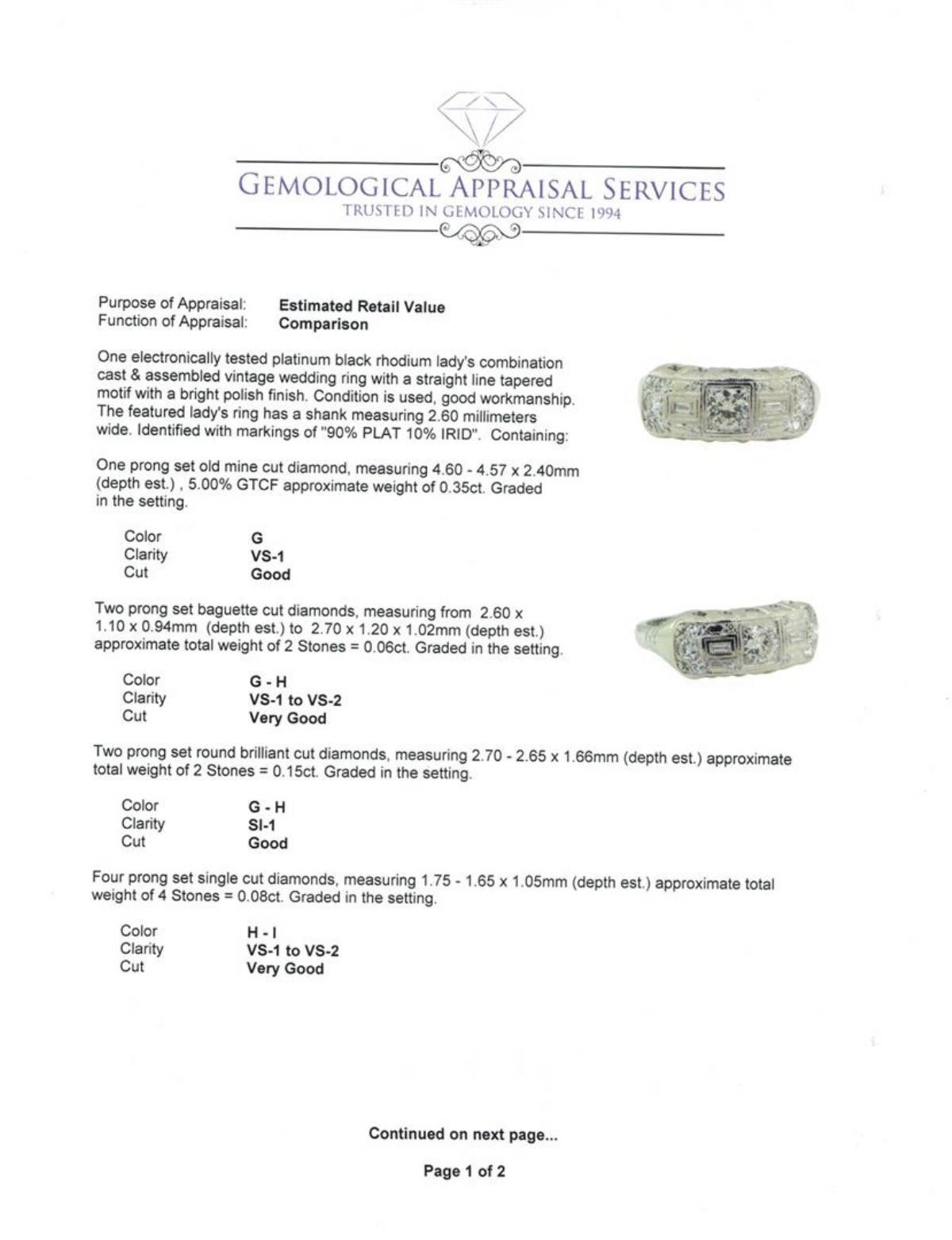 One electronically tested platinum black rhodium lady's combination cast & assembled vintage wedding ring with a straight line tapered motif with a bright polish finish. The featured lady's ring has a shank measuring 2.60 millimeters wide. Identified with markings of '90%. PLAT 10%. IRID'. Condition is used, good workmanship. Containing: One prong set old mine cut diamond, measuring 4.60 - 4.57 x 2.40mm (depth est.) , 5.00.%. GTCF approximate weight of 0.35ct. Graded in the setting. Color G Clarity VS-1 Cut Good Two prong set baguette cut diamonds, measuring from 2.60 x 1.10 x 0.94mm (depth est.) to 2.70 x 1.20 x 1.02mm (depth est.) approximate total weight of 2 Stones = 0.06ct. Graded in the setting. Color G - H Clarity VS-1 to VS-2 Cut Very Good Two prong set round brilliant cut diamonds, measuring 2.70 - 2.65 x 1.66mm (depth est.) approximate total weight of 2 Stones = 0.15ct. Graded in the setting. Color G - H Clarity SI-1 Cut Good Four prong set single cut diamonds, measuring 1.75 - 1.65 x 1.05mm (depth est.) approximate total weight of 4 Stones = 0.08ct. Graded in the setting. Color H - I Clarity VS-1 to VS-2 Cut Very Good Four prong set single cut diamonds, measuring 1.20 - 1.15 x 0.73mm (depth est.) approximate total weight of 4 Stones = 0.03ct. Graded in the setting. Color G - I Clarity VS-1 to VS-2 Cut Good. Total Weight of Diamonds 0.67ct.. Total Weight of Ring 5.70gm GAS Appraised at $3115.00. GAS Appraised at $3,115.00.