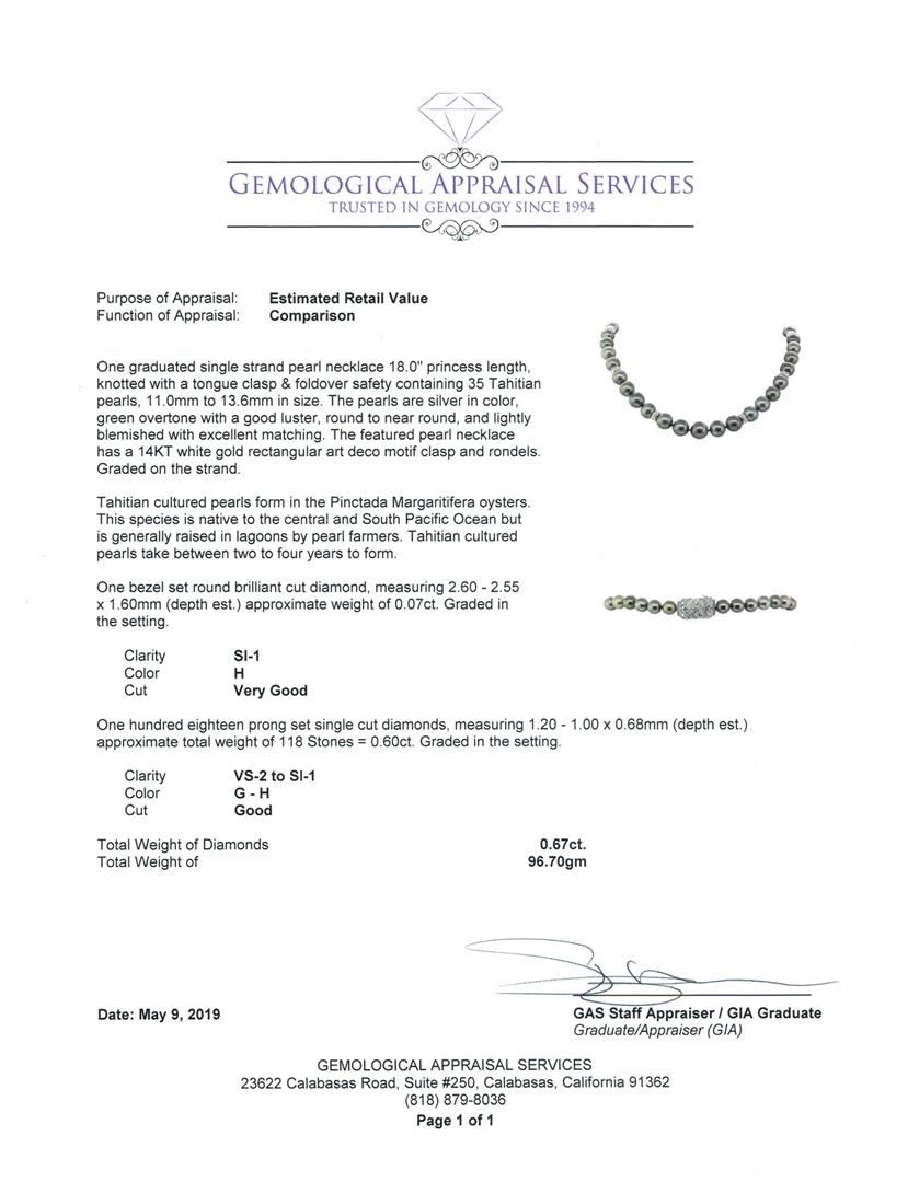 One graduated single strand pearl necklace 18.0' princess length, knotted with a tongue clasp & foldover safety containing 35 Tahitian pearls, 11.0mm to 13.6mm in size. The pearls are silver in color, green overtone with a good luster, round to near round, and lightly blemished with excellent matching. The featured pearl necklace has a 14KT white gold rectangular art deco motif clasp and rondels. Graded on the strand.Tahitian cultured pearls form in the Pinctada Margaritifera oysters. This species is native to the central and South Pacific Ocean but is generally raised in lagoons by pearl farmers. Tahitian cultured pearls take between two to four years to form. One bezel set round brilliant cut diamond, measuring 2.60 - 2.55 x 1.60mm (depth est.) approximate weight of 0.07ct. Graded in the setting. Color H Clarity SI-1 Cut Very Good One Hundred Eighteen prong set single cut diamonds, measuring 1.20 - 1.00 x 0.68mm (depth est.) approximate total weight of 118 Stones = 0.60ct. Graded in the setting. Color G - H Clarity VS-2 to SI-1 Cut Good. Total Weight of Diamonds 0.67ct.. Total Weight of 96.70gm GAS Appraised at $19815.00. GAS Appraised at $19,815.00.