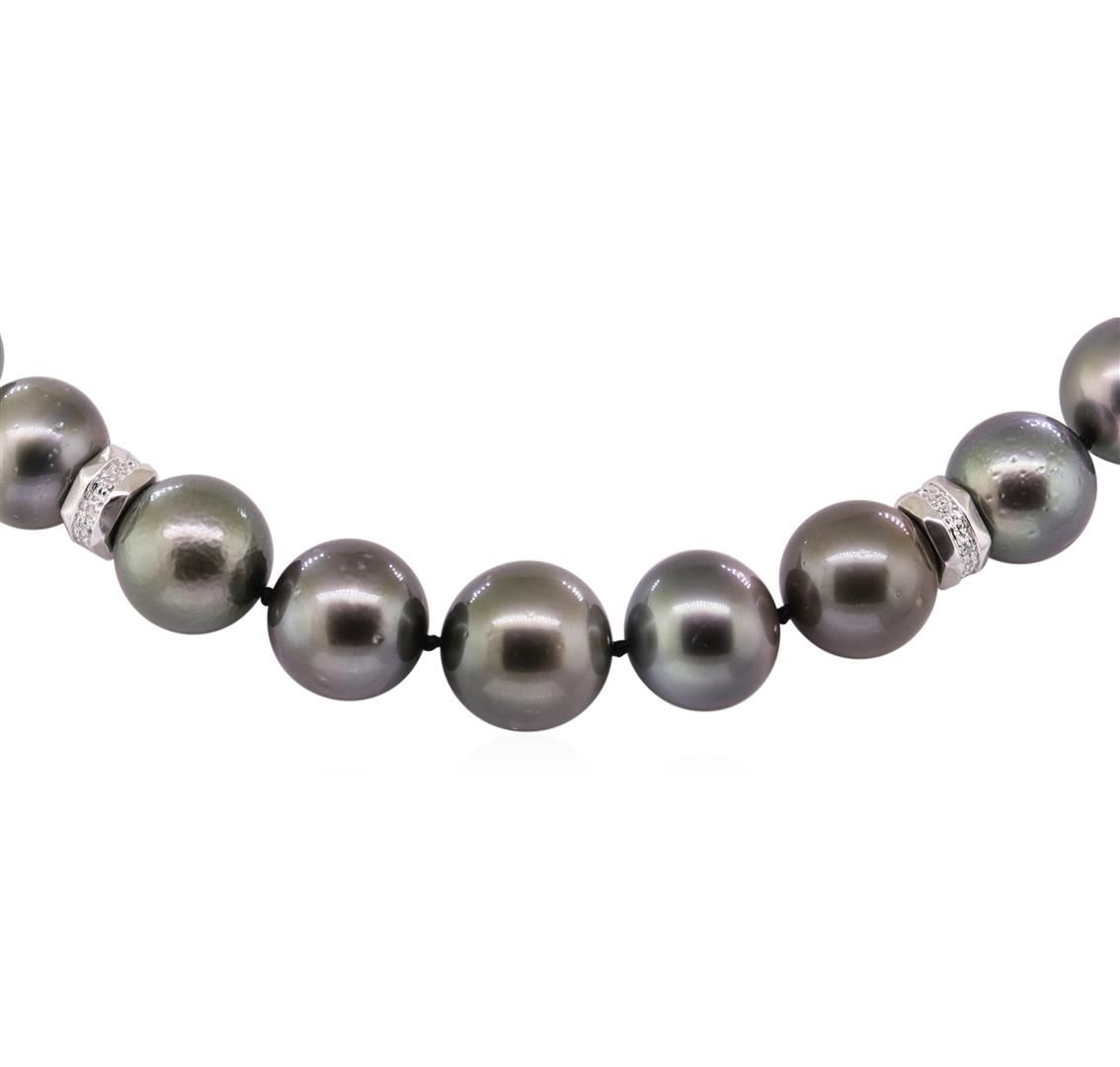 One graduated single strand pearl necklace 18.0' princess length, knotted with a tongue clasp & foldover safety containing 35 Tahitian pearls, 11.0mm to 13.6mm in size. The pearls are silver in color, green overtone with a good luster, round to near round, and lightly blemished with excellent matching. The featured pearl necklace has a 14KT white gold rectangular art deco motif clasp and rondels. Graded on the strand.Tahitian cultured pearls form in the Pinctada Margaritifera oysters. This species is native to the central and South Pacific Ocean but is generally raised in lagoons by pearl farmers. Tahitian cultured pearls take between two to four years to form. One bezel set round brilliant cut diamond, measuring 2.60 - 2.55 x 1.60mm (depth est.) approximate weight of 0.07ct. Graded in the setting. Color H Clarity SI-1 Cut Very Good One Hundred Eighteen prong set single cut diamonds, measuring 1.20 - 1.00 x 0.68mm (depth est.) approximate total weight of 118 Stones = 0.60ct. Graded in the setting. Color G - H Clarity VS-2 to SI-1 Cut Good. Total Weight of Diamonds 0.67ct.. Total Weight of  96.70gm GAS Appraised at  $19815.00. GAS Appraised at $19,815.00.