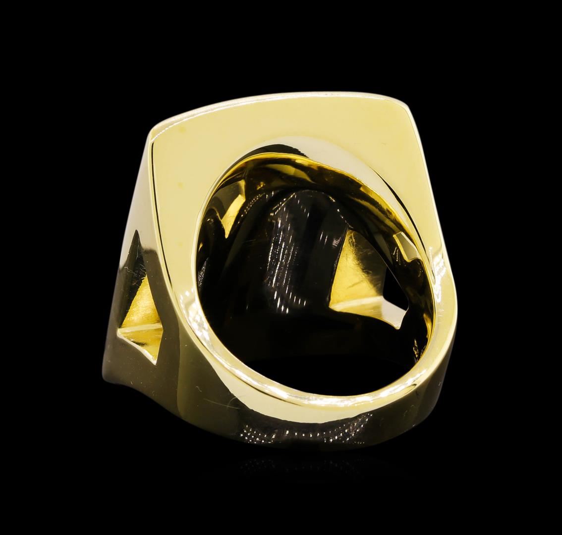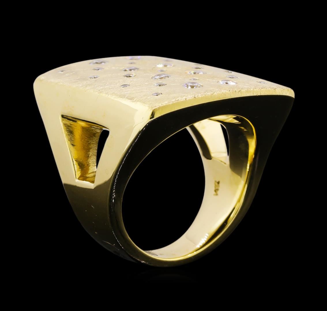One electronically tested 14KT yellow gold lady's cast fashion ring with a bright polish, hand-engraved detail finish. Lady's ring has a shank measuring 4.90 mm in width. Identified with markings of "14K". Condition is new, good workmanship. Containing: Eight bezel set round brilliant cut diamonds, measuring 2.60 - 2.50 x 1.61mm (depth est.) approximate total weight of 8 Stones = 0.51ct. Graded in the setting. Clarity: VS-1 to VS-2. Color: G - H. Cut Very Good Six bezel set round brilliant cut diamonds, measuring 1.50 - 1.40 x 0.91mm (depth est.) approximate total weight of 6 Stones = 0.07ct. Graded in the setting. Clarity: VS-1 to VS-2. Color: G - Very Good Eleven bezel set round brilliant cut diamonds, measuring 1.35 - 1.20 x 0.81mm (depth est.) approximate total weight of 11 Stones = 0.10ct. Graded in the setting. Clarity: VS-1 to VS-2. Color: G - Very Good. Total Weight of Diamonds 0.68ct. Total Weight of Ring 37.40gm. GAS Appraised at $8,465.00.