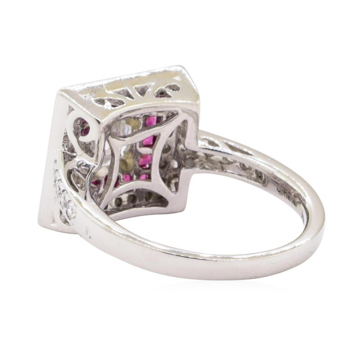 Platinum and diamond ring. A round cut diamond is prong set in a contemporary style ring. Square cut rubies encircle the center stone. Round brilliant cut diamonds accent the custom design. The ring is cast, stamped platinum and has a total gross weight of 8.10 grams. Mounting Attributes Metal: Platinum Gross Weight.: 8.10 Grams Construction: Cast /Custom Diamond Attributes Cutting Style: Round Brilliant Cut Measurements: 6.65 x 6.68 x 4.23 mm Carat Weight.:1.22 Carats total weight by formula estimation Depth:.63.00% Table:.59.00% Girdle Thickness: Unknown Culet: None Symmetry: Very Good Polish: Very Good Clarity Grade: I1 Color Grade: H Fluorescence: None Diamond I Ruby Accents Cutting Style: Round Brilliant Cut/ Square Cut Approximately 34 Diamonds Measure: 1.50 mm Individual Carat Weight: 0.01 - 0.02 Carats each by formula estimation Total Carat: 0.42 Carats total weight by formula estimation General: VS2 - SI1 Average: G - H Approximately 14 Rubies Measure: 2.50 - 2.50 x 1.50 mm Individual Carat Weight : 0.04 - 0.07 Carats each by formula estimation Total Carat Weight: 0.68 Carats total weight by formula estimation Estimated Retail Value: $7,500