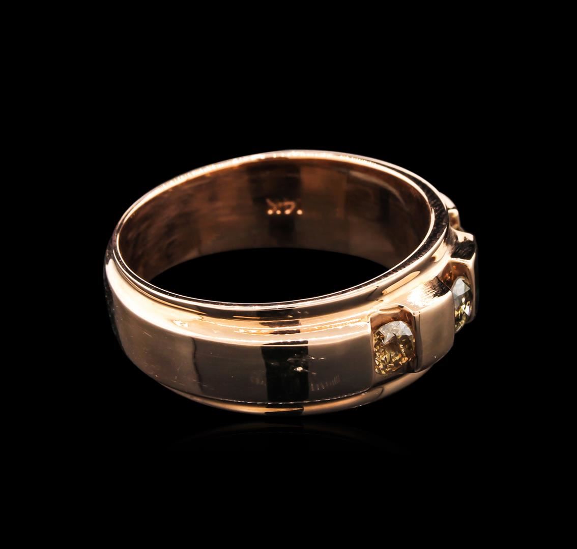 One electronically tested 14KT rose gold gents cast diamond ring with a bright polish finish. The ring features a three diamond series, completed by a grooved six millimeter wide band. Identified with markings of "14K". Condition is new, good workmanship. Containing: Three channel set round brilliant cut diamonds, measuring 3.80 - 3.70 x 2.25mm (depth est.) approximate total weight of 3 Stones = 0.68ct. Color grade is an average for the group. Graded in the setting. Clarity: I-1 to I-2. Total Weight of Diamonds 0.68ct. Total Weight of Ring 10.29gm. AIG Appraised at $2,795.00.