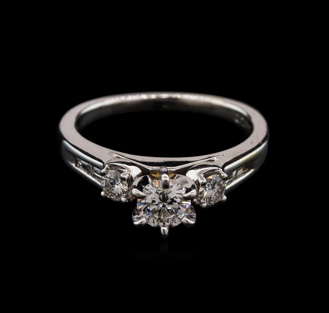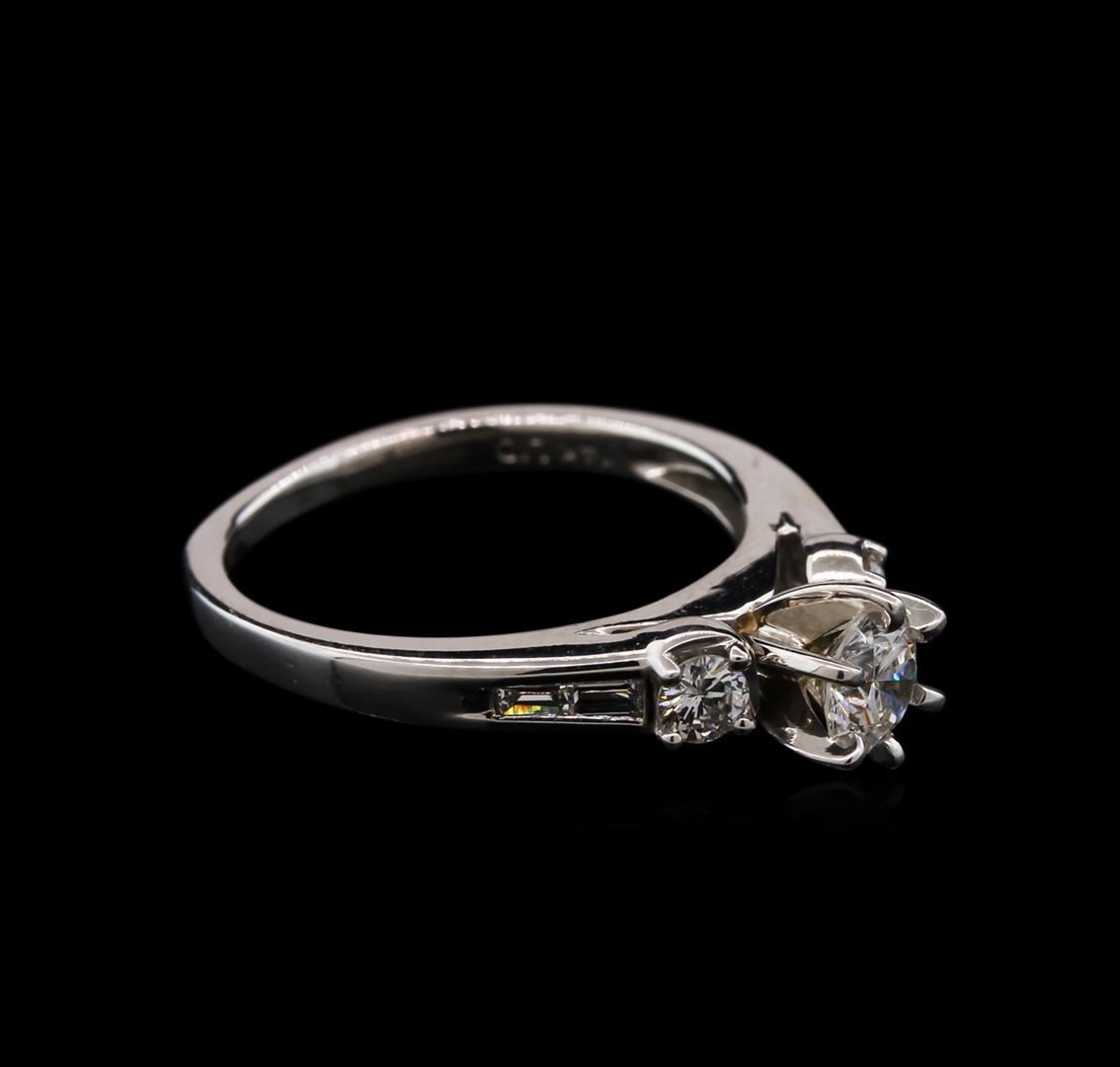 One electronically tested 14KT white gold lady's cast 3-stone ring with a tapered shank with a bright polish finish. The featured lady's ring has a 1.65 millimeter wide shank. Identified with markings of "14K". Condition is new, good workmanship. Containing: One prong set round brilliant cut diamond, measuring 4.53 - 4.50 x 2.94mm (depth est.) approximate weight of 0.37ct. Graded in the setting. Clarity: VS-2. Color: H. Cut Very Good Two prong set round brilliant cut diamonds, measuring 2.90 - 2.80 x 1.85mm (depth est.) approximate. Total Weight of 2 Stones = 0.20ct. Graded in the setting. Clarity: VS-2 to SI-1. Color: H - I. Cut Good Four channel set baguette cut diamonds, measuring from 2.00 x 1.00 x 0.85mm (depth est.) to 2.20 x 1.50 x 1.27mm (depth est.) approximate. Total Weight of 4 Stones = 0.12ct. Graded in the setting. Clarity: VS-1 to VS-2. Color: G - Good. Total Weight of Diamonds 0.69ct. Total Weight of Ring 3.00gm. GAS Appraised at $4,170.00.