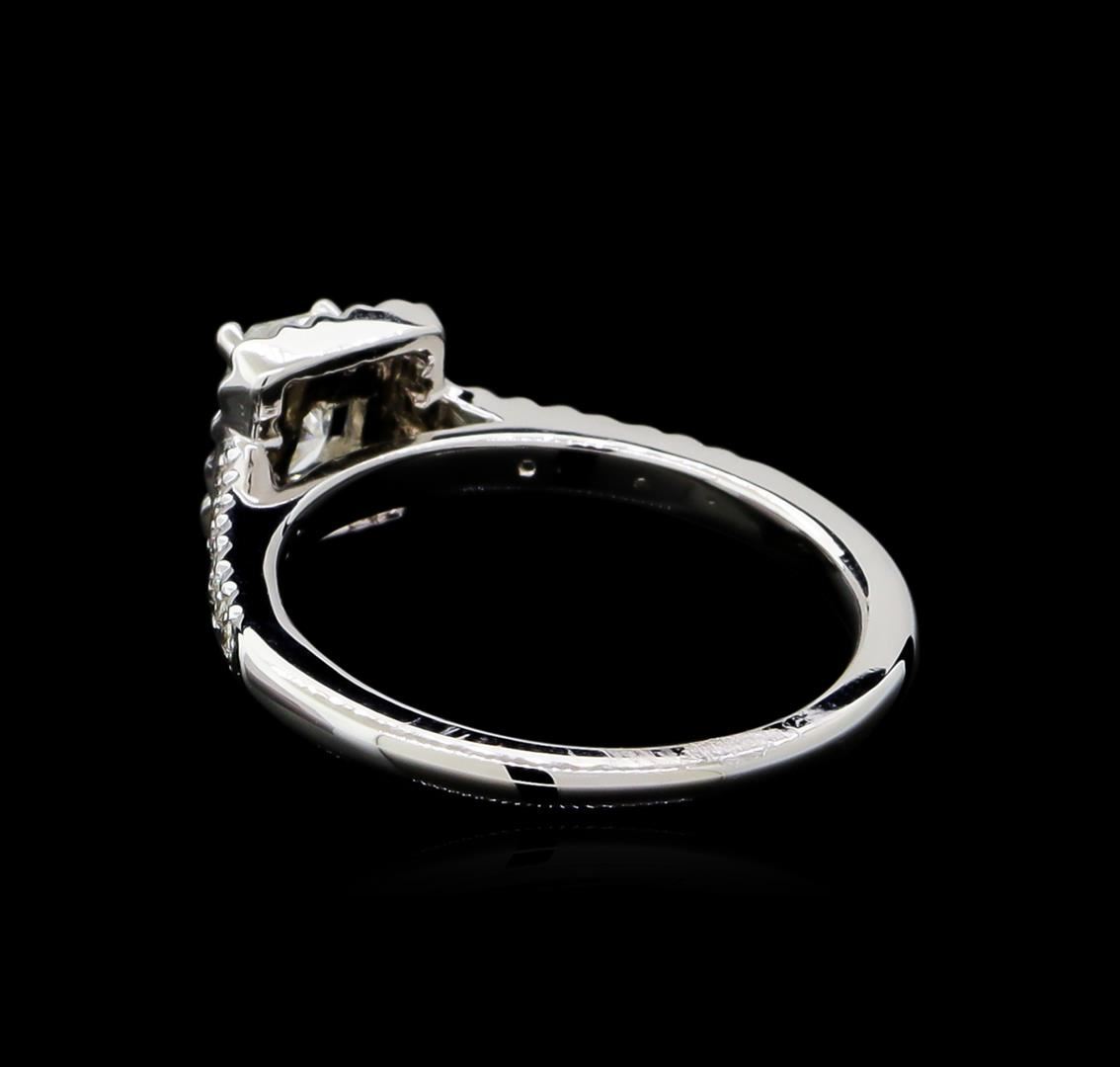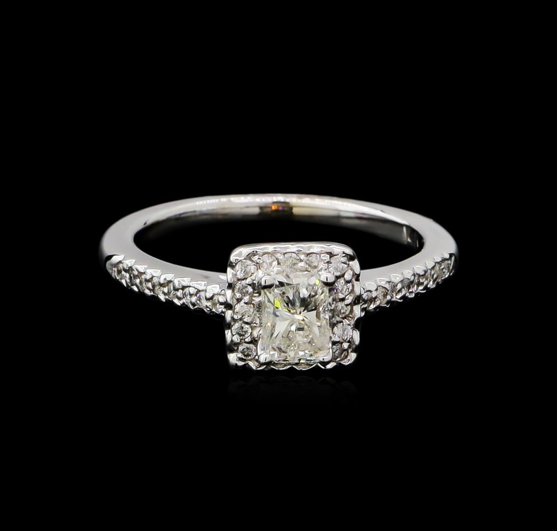 One electronically tested 14KT white gold ladies cast diamond unity ring with a bright polish finish. The featured diamond is set within a diamond bezel supported by diamond ribbon shoulders, completed by a one and one-half millimeter wide band. Identified with markings of "14K". Condition is new, good workmanship. Containing: One prong set radiant shaped cut diamond, measuring 5.20 x 3.80 x 3.00mm (depth est.) approximate weight of 0.51ct with a medium blue fluorescence. Graded in the setting. Clarity: I-2. Color: 79.0%. Table 73.7%. Thirty-Two prong set round brilliant cut diamonds approximate total weight of 32 Stones = 0.18ct. Graded in the setting. Clarity: SI-2 to I-2. Color: G - H. Total Weight of Diamonds 0.69ct. Total Weight of Ring 3.52gm. AIG Appraised at $3,140.00.