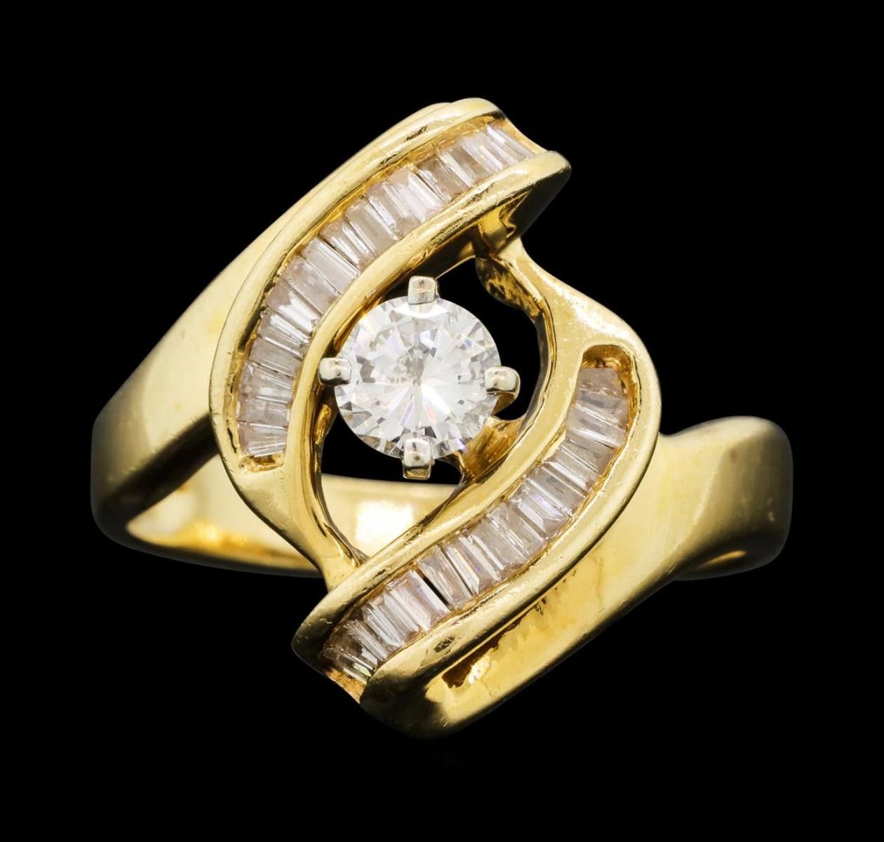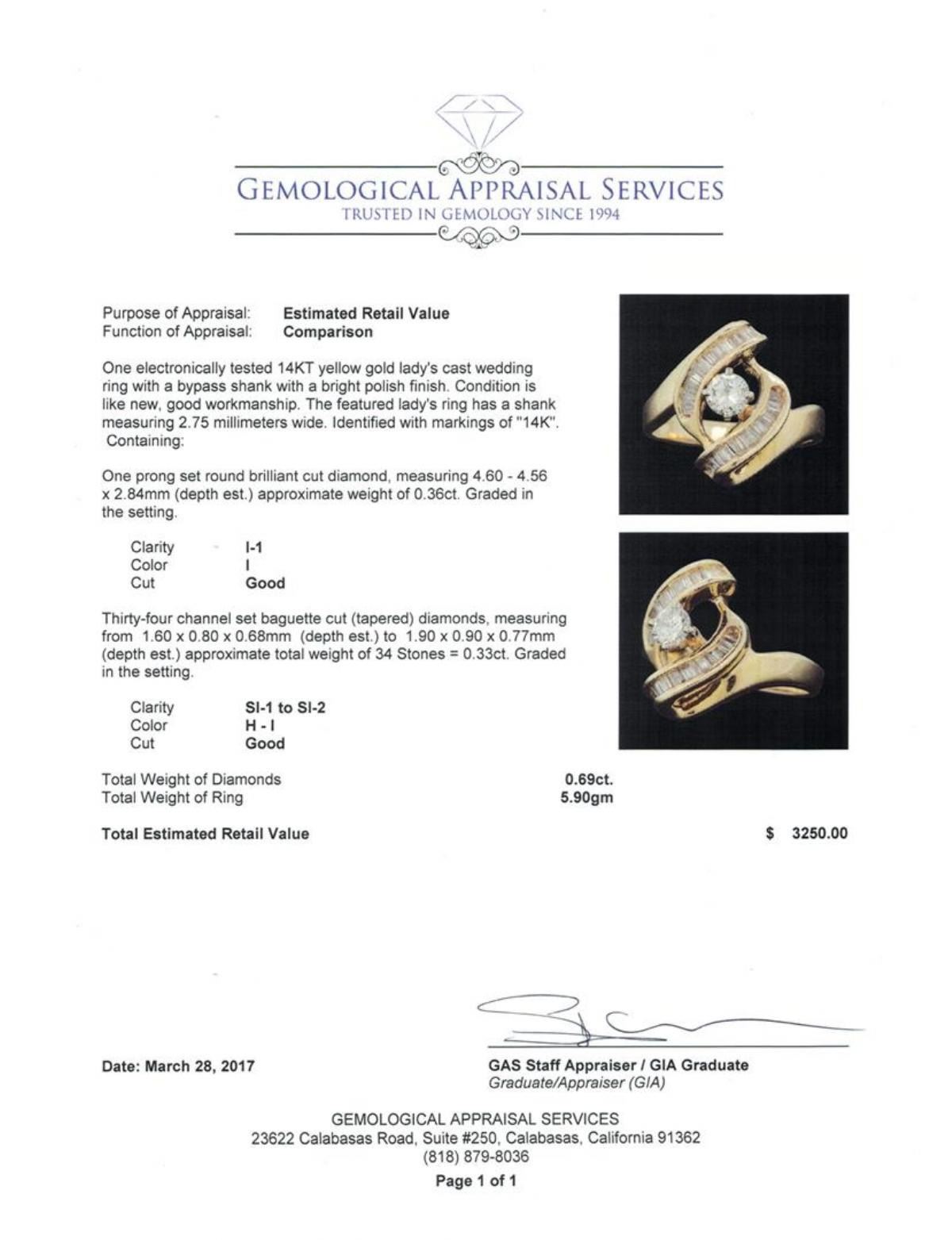 One electronically tested 14KT yellow gold lady's cast wedding ring with a bypass shank with a bright polish finish. The featured lady's ring has a shank measuring 2.75 millimeters wide. Identified with markings of '14K'. Condition is like new, good workm GAS Appraised at $3,250.00.