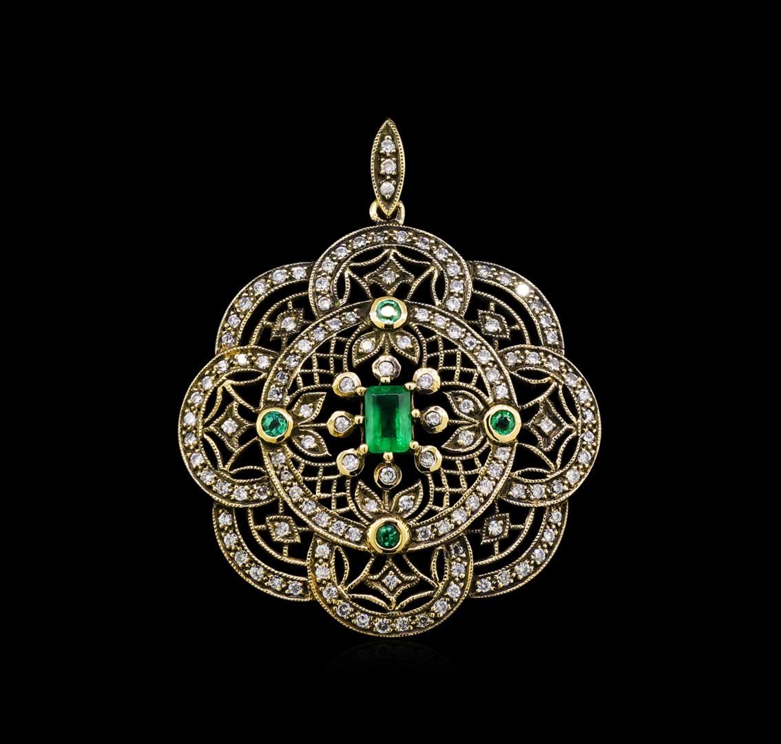 One electronically tested 18KT yellow lady's combination cast & assembled fashion pendant with a bright polish with milgrain detailing finish. Identified with markings of "18K". Condition is used, good workmanship. Containing: One prong set emerald step cut natural emerald, measuring 6.10 x 3.95 x 3.00mm, approximate weight of 0.53ct., clarity is moderately included, type III, medium, very slightly grayish, very slightly bluish green color, (GIA vslbG 5/3), cut is good. Transmitting light somewhat diffusely, transparent to translucent. Indications of oil residue. Graded in the setting. Four bezel set round standard brilliant cut natural emeralds, measuring 2.30 - 2.20 x 1.40 mm, approximate total weight of 0.16ct., clarity is eye clean, type III, medium, moderately strong, green color, (GIA G 5/4), cut is very good. Transmitting light with a minimum of distortion, transparent. Indications of oil residue. Graded in the setting. Six bezel set round brilliant cut diamonds, measuring 1.70 - 1.60 x 1.04mm (depth est.) approximate total weight of 6 Stones = 0.10ct. Graded in the setting. Clarity: VS-2 to SI-1. Color: H - I. Cut Very Good One Hundred Twenty-One prong set round brilliant cut diamonds, measuring 1.40 - 1.35 x 0.87mm (depth est.) approximate total weight of 121 Stones = 1.21ct. Graded in the setting. Clarity: VS-2 to SI-1. Color: G - I. Cut Good. Total Weight of Colored Stones 0.69ct. Total Weight of Diamonds 1.31ct. Total Weight of Pendant 13.70gm. GAS Appraised at $6,880.00.