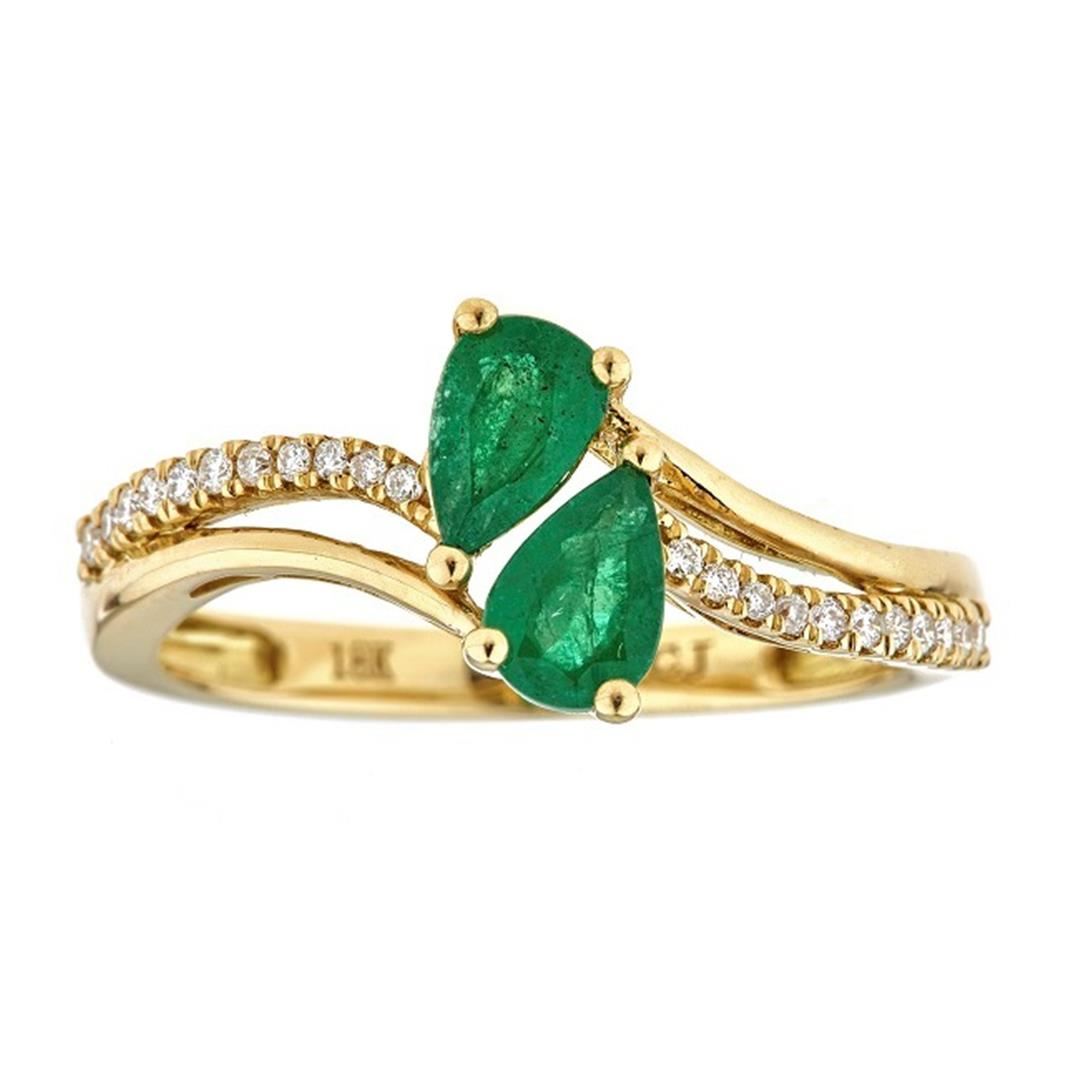 One Emerald and Diamond Ring featuring: 18KT Yellow Gold weighing a total of 2.85 grams, Two Emeralds with a total weight of 0.69ct, and 22 Diamonds with a total weight of 0.11ctw.
