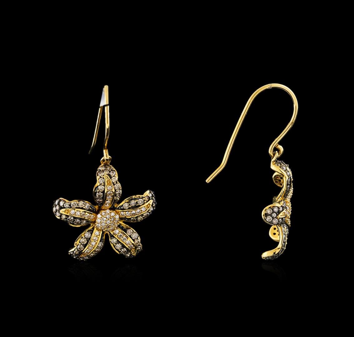 One pair electronically tested 14KT yellow gold ladies cast & assembled diamond flower earrings with French hooks. Each earring features a dangling diamond encrusted flower reminiscent of a Lily. Bright and anodized finish. Trademark is BH. Identified with markings of "14K". Condition is new, good workmanship. Containing: One Hundred Thirty prong set round brilliant cut diamonds, measuring 1.20 - 0.80 x 0.60mm (depth est.) approximate total weight of 130 Stones = 0.49ct. Color grade is an average for the group. Graded in the setting. Clarity: SI-1 to SI-2 Eighty-Eight prong set single cut diamonds, measuring 0.90 - 0.80 x 0.51mm (depth est.) approximate total weight of 88 Stones = 0.20ct. Graded in the setting. Clarity: VS-2 to SI-2. Color: G - H. Total Weight of Diamonds 0.69ct. Total Weight of Earrings 5.08gm. AIG Appraised at $3,705.00.